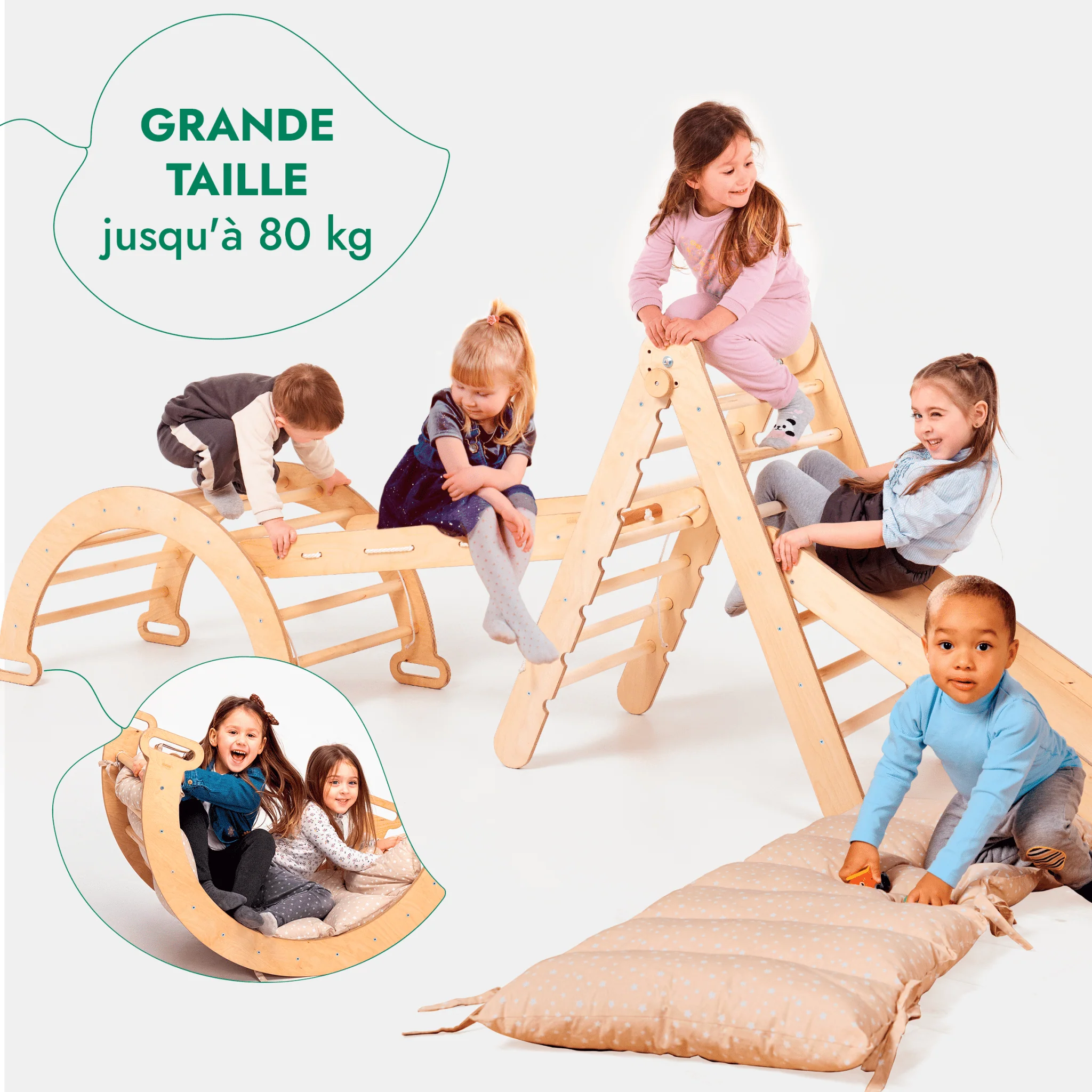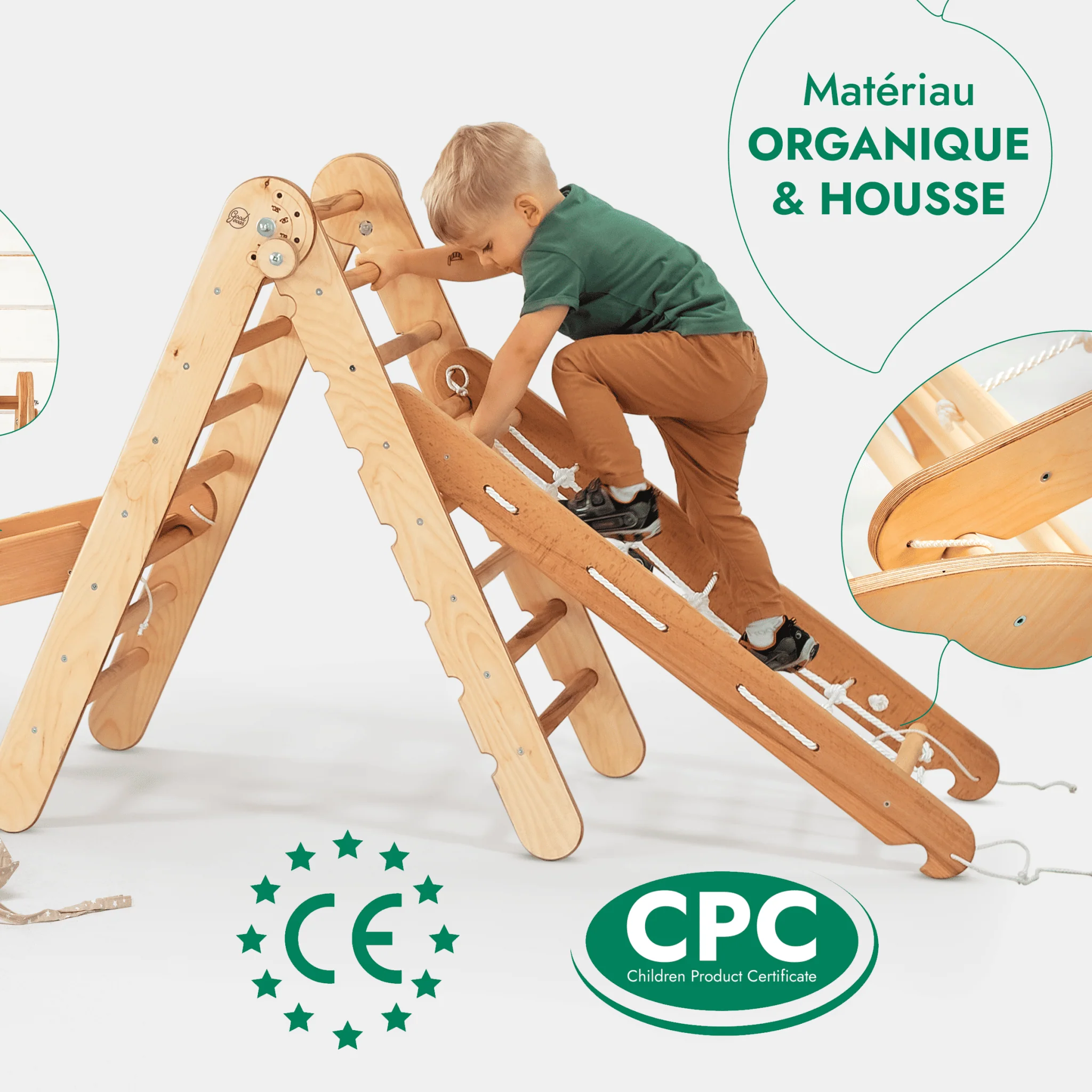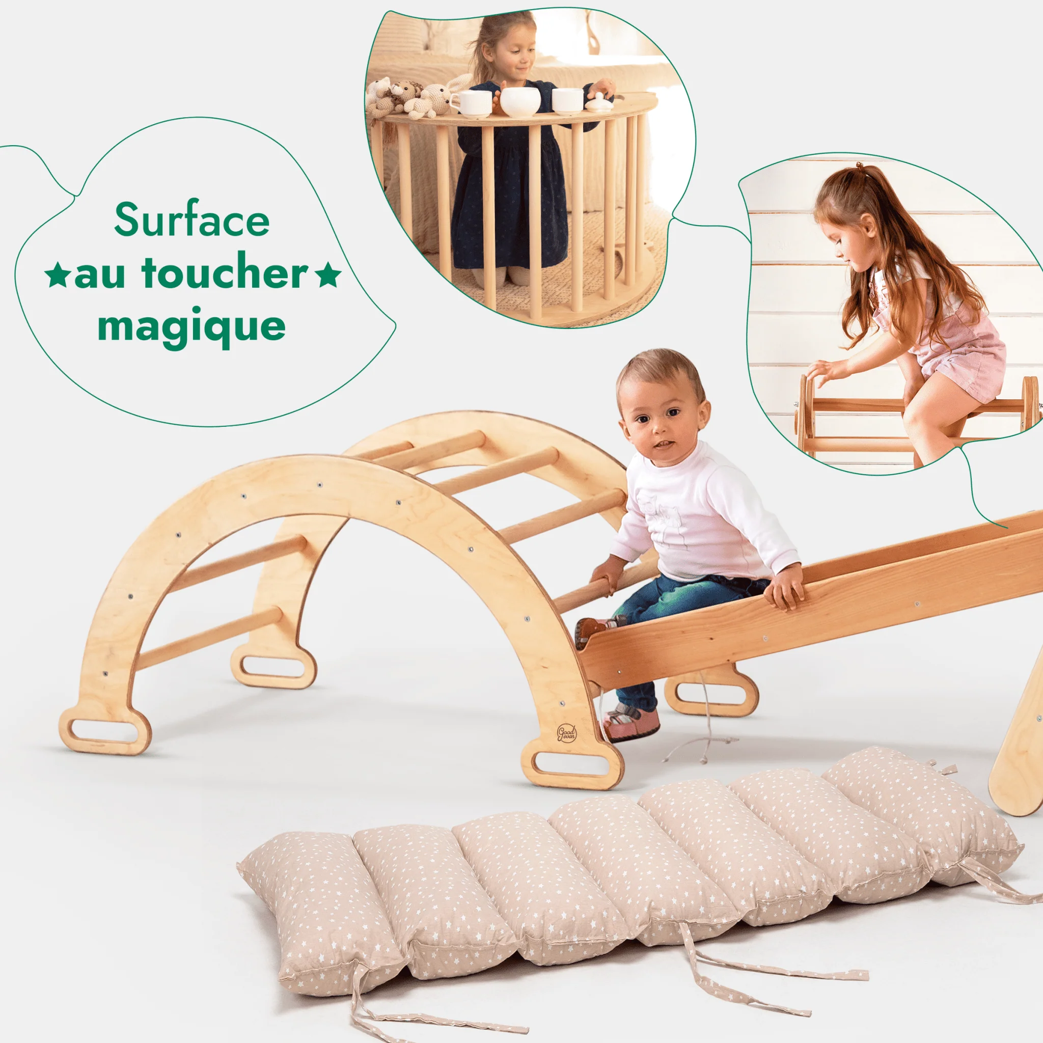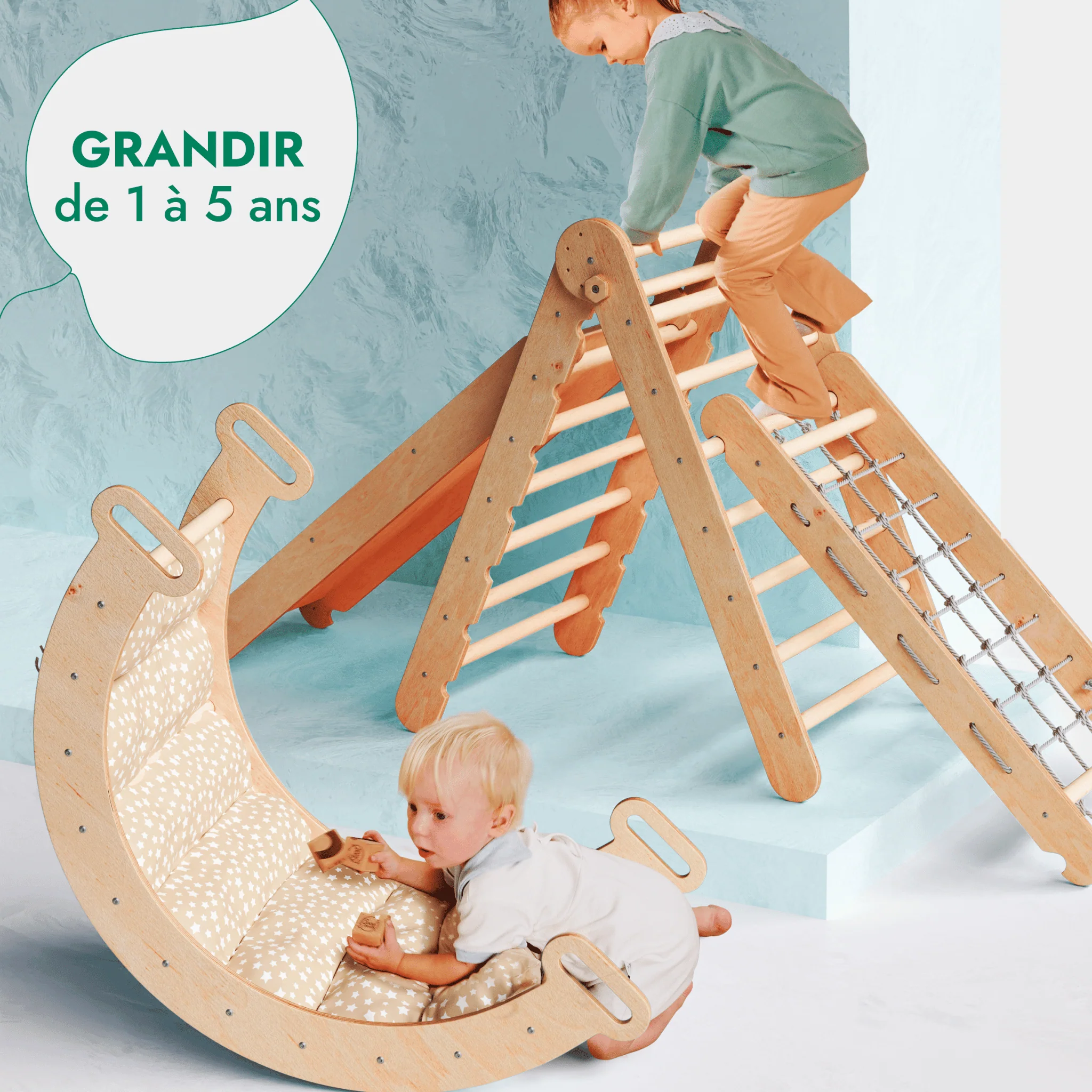 Améliorez l’expérience de jeu de votre enfant avec notre ensemble d’escalade Montessori 5en1, l’un des produits phares de Goodevas. Comprenant les éléments de base de l’arche d’escalade et de l’échelle triangulaire, cet ensemble est accentué par le filet à grimper multifonctionnel, le toboggan/rampe et le сushion. Ensemble, ils ouvrent les portes du jeu imaginatif, favorisant la force musculaire, l’équilibre, la coordination, l’affinement de la motricité et la confiance en soi. Ingénieusement conçu pour s’interconnecter, cet ensemble permet aux enfants de créer de nouveaux paysages de jeu qui évoluent avec leur croissance et leur créativité. Ensemble, ils ouvrent les portes du jeu imaginatif et favorisent la force musculaire, l’équilibre, la coordination, l’affinement de la motricité et le renforcement de la confiance en soi. Ingénieusement conçu pour s’interconnecter, cet ensemble permet aux enfants de créer de nouveaux paysages ludiques qui évoluent avec leur croissance et leur créativité.