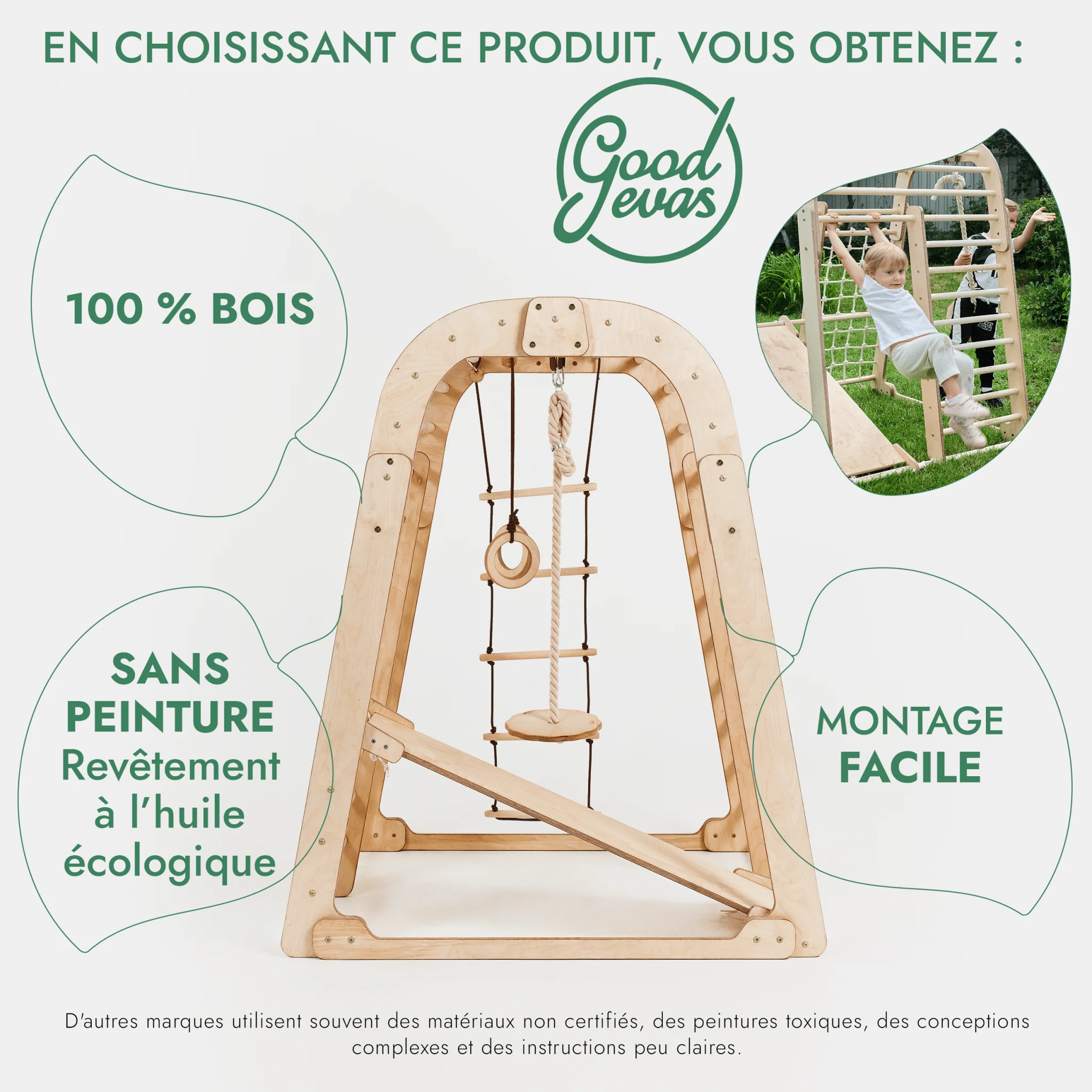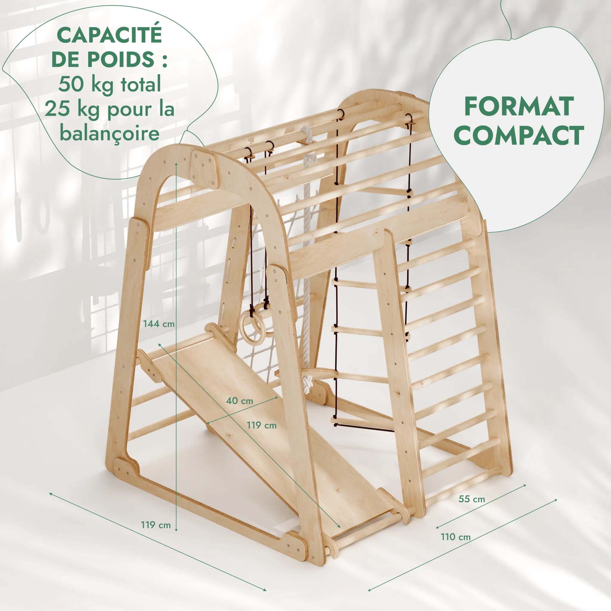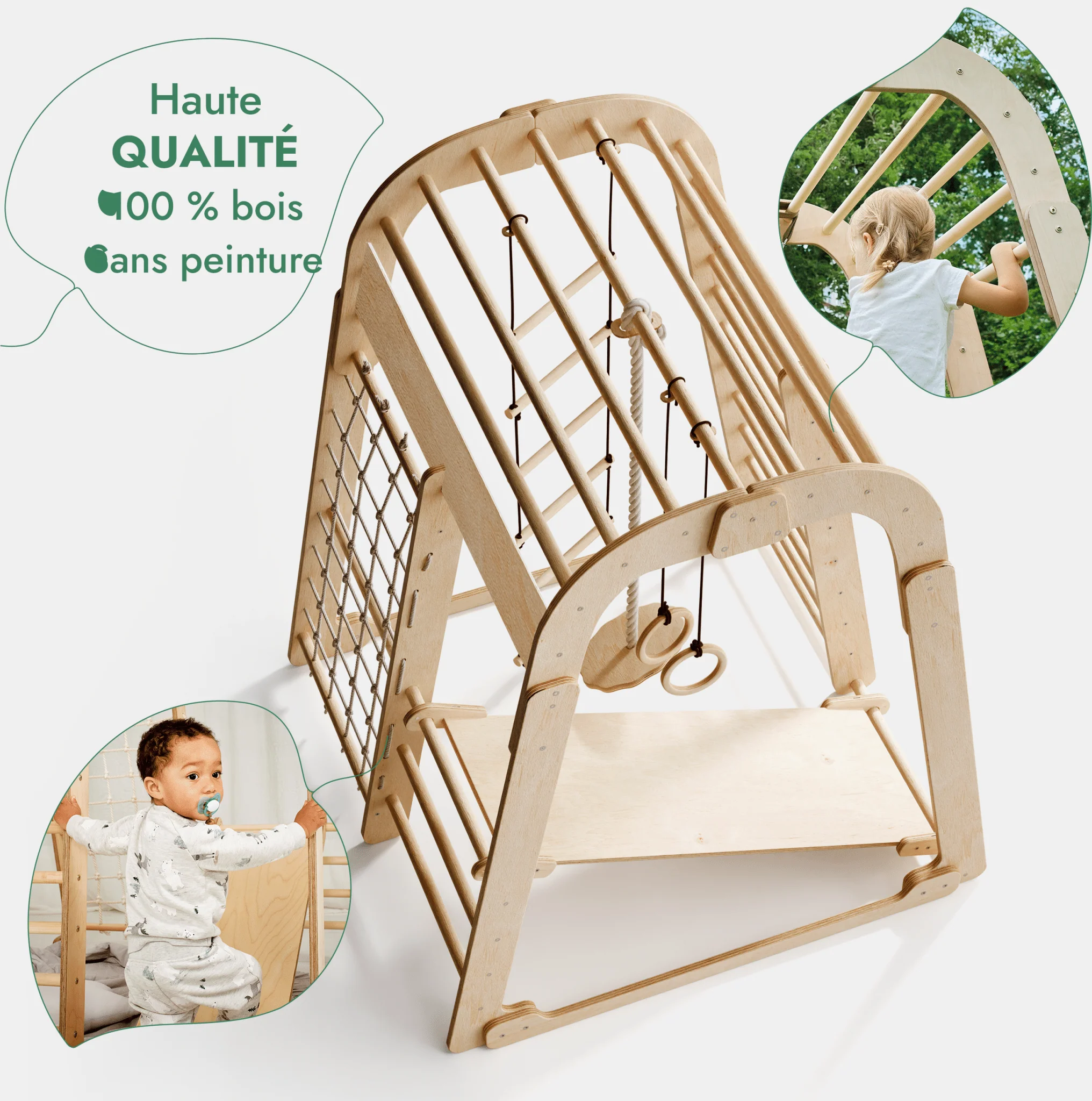 Voici l’Aire de Jeu pour Enfants, une structure d’escalade multifonctionnelle méticuleusement fabriquée et inspirée de l’approche Montessori. Conçue pour les enfants de 3 à 8 ans, cette aire de jeux permet aux jeunes explorateurs de développer des compétences telles que l’équilibre, la coordination et la motricité, tout en s’amusant ! La structure comprend :