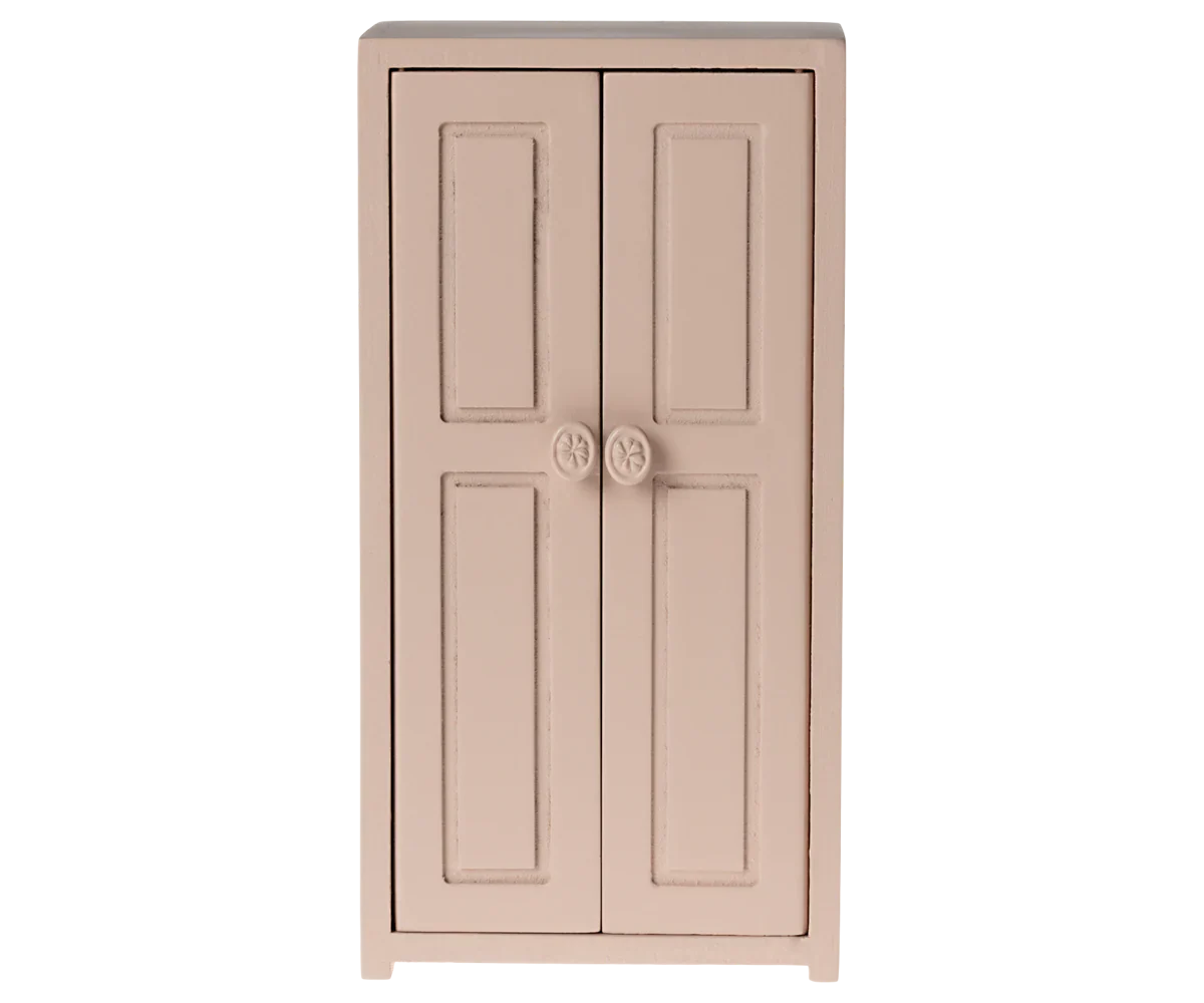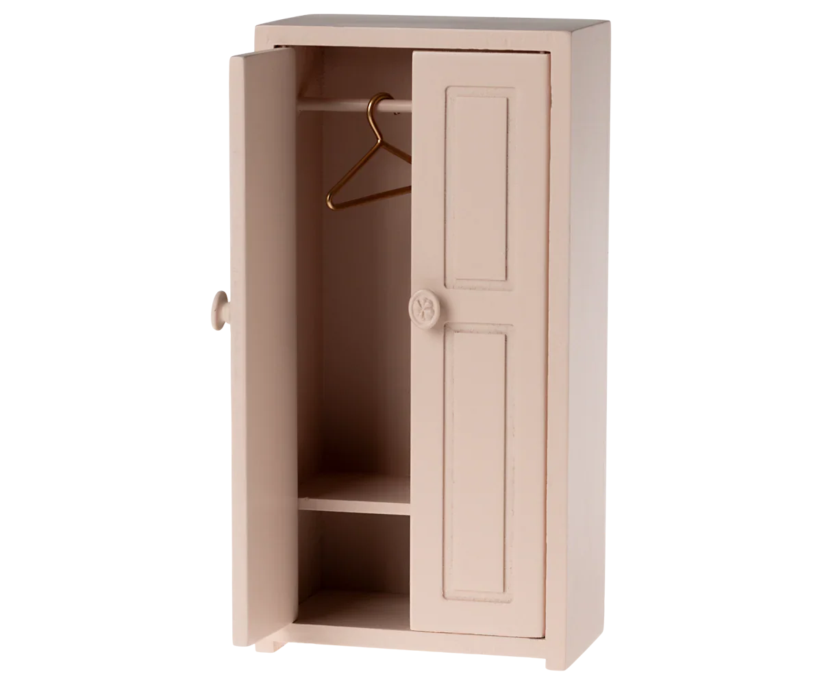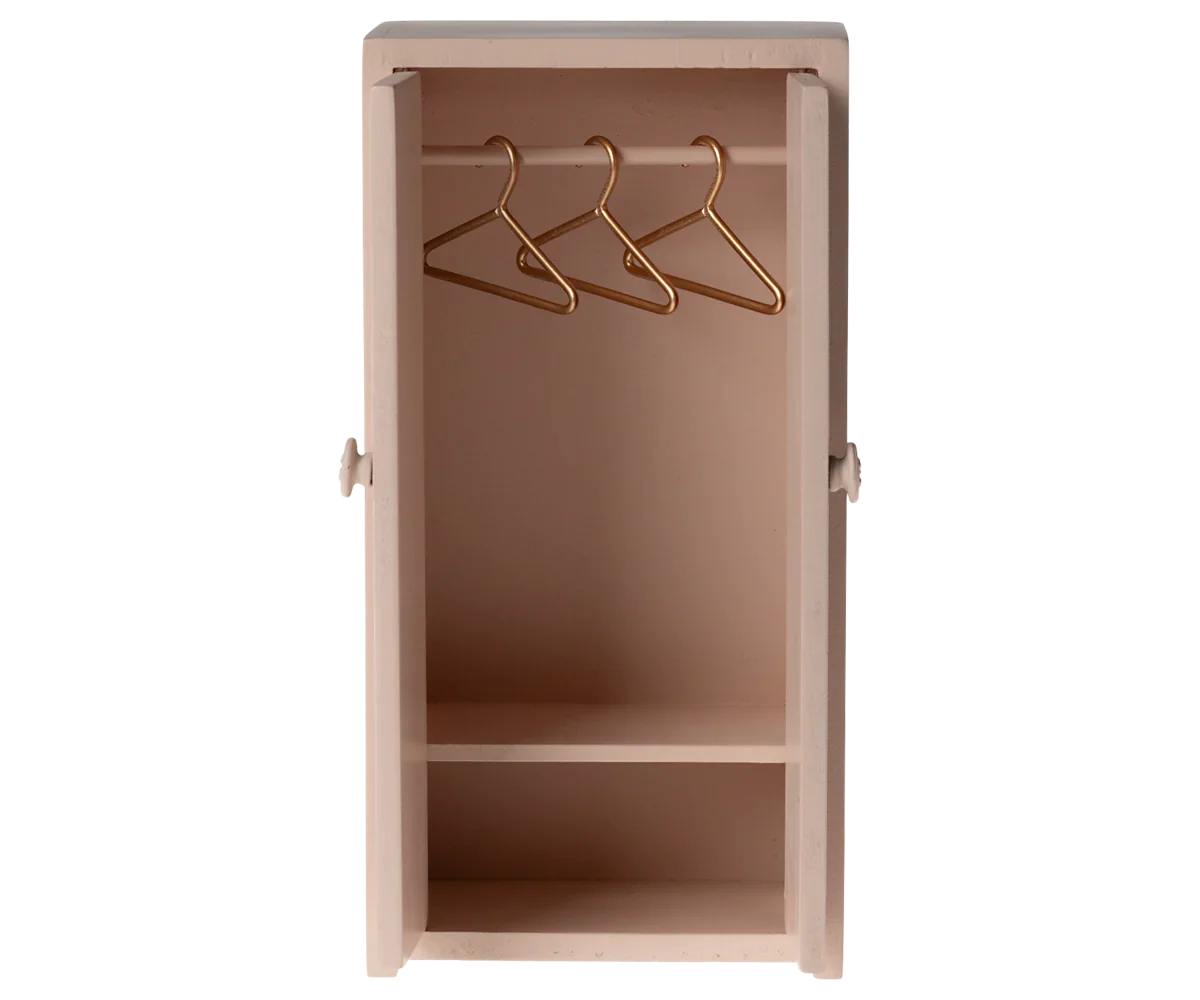 Cette petite armoire en bois permettra à la famille souris d’organiser sa garde-robe. La penderie est livrée avec 3 cintres dorés.