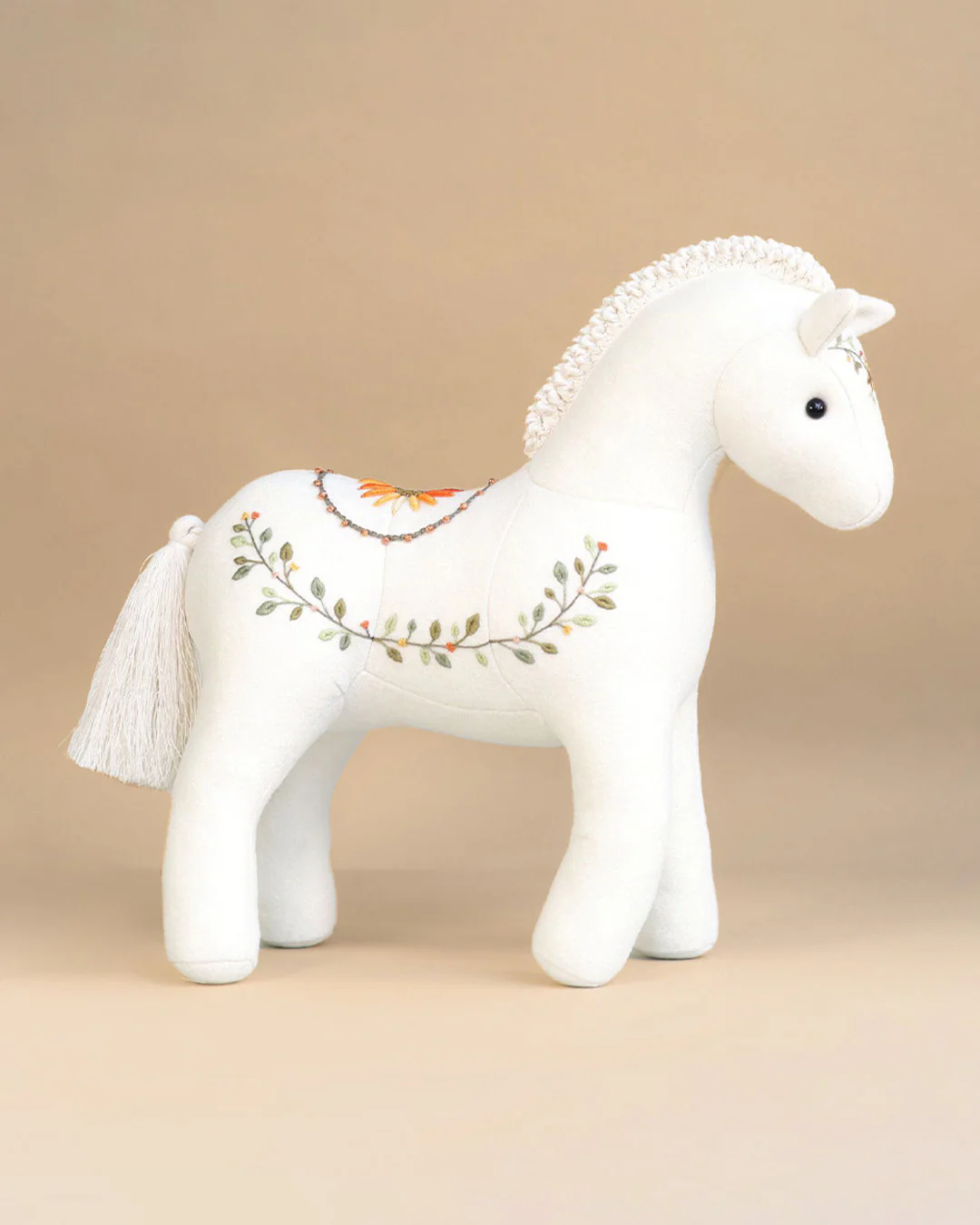 Conçu comme une œuvre d’atelier, ce cheval incarne un luxe discret, poétique et responsable, porté par le choix de matières nobles telles que le lin, la laine et les yeux en verre.