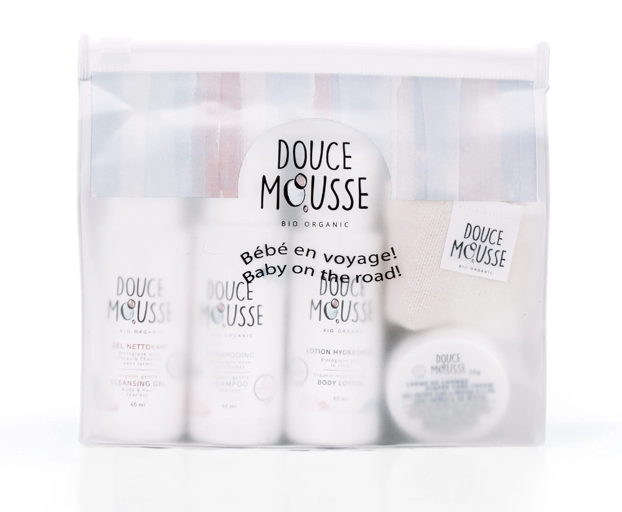 Idéal pour le sac à couche ou pour les visites chez les grands-parents, la trousse Douce Mousse »bébé en voyage » comprend: 1 gel nettoyant corps et visage 60 ml + 1 shampooing 60 ml + 1 lotion hydratante pour le corps + 1 crème de change 15g + lingette 100% coton bio, le tout dans une petite pochette hermétique munie d’une fermeture éclair.