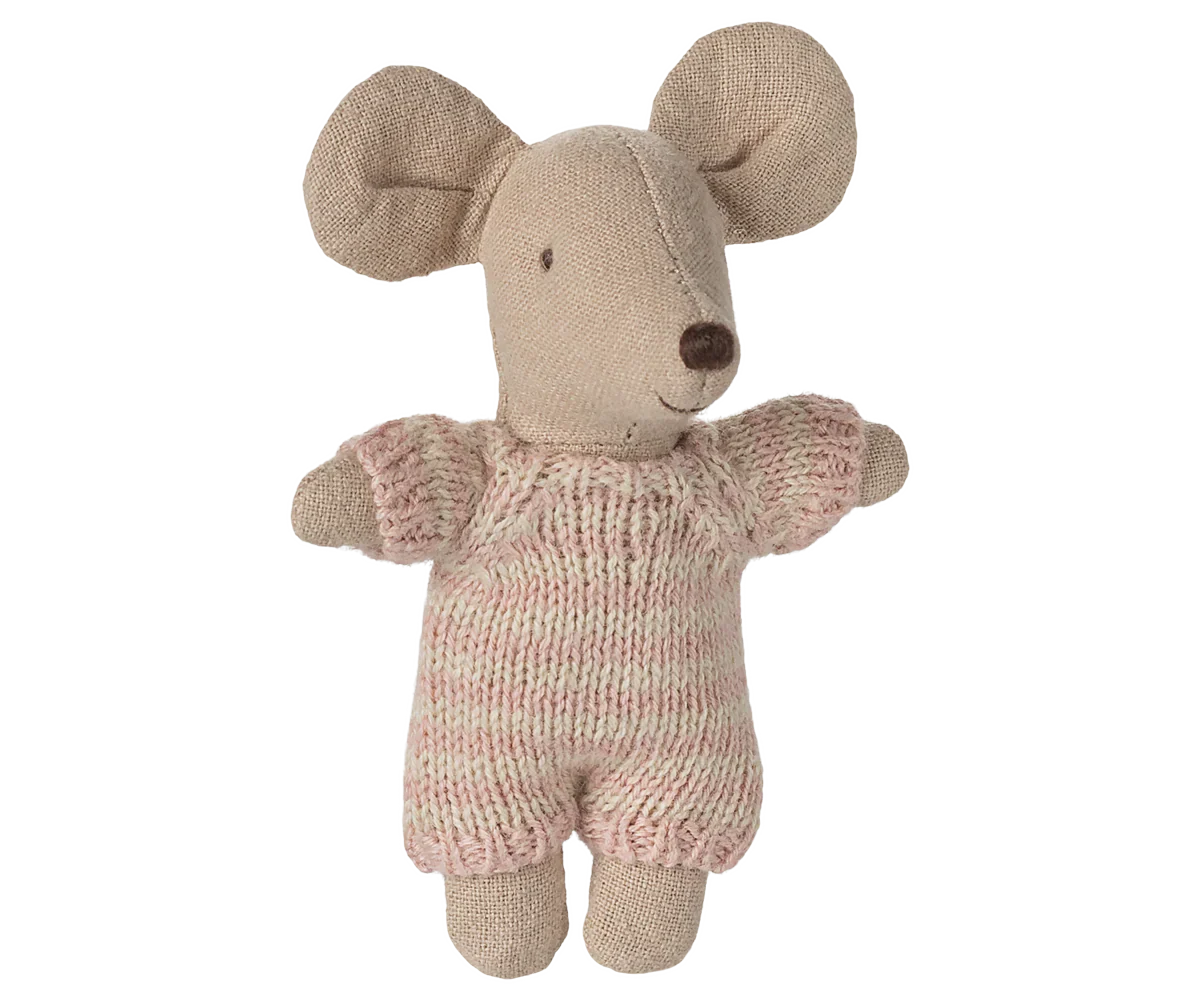 Un adorable bébé souris vêtu d’une combinaison, en tricot, douce et rayée. Bébé souris dort pendant des heures dans son couffin matelassé et peut être transporté dans toutes vos escapades.