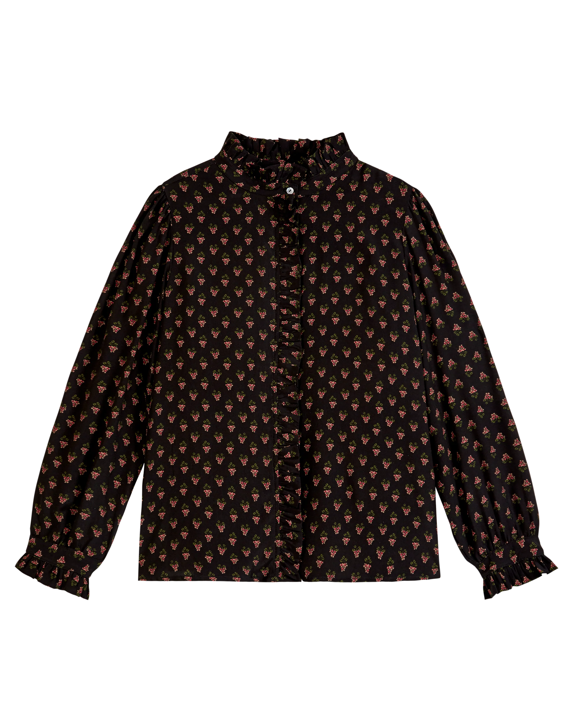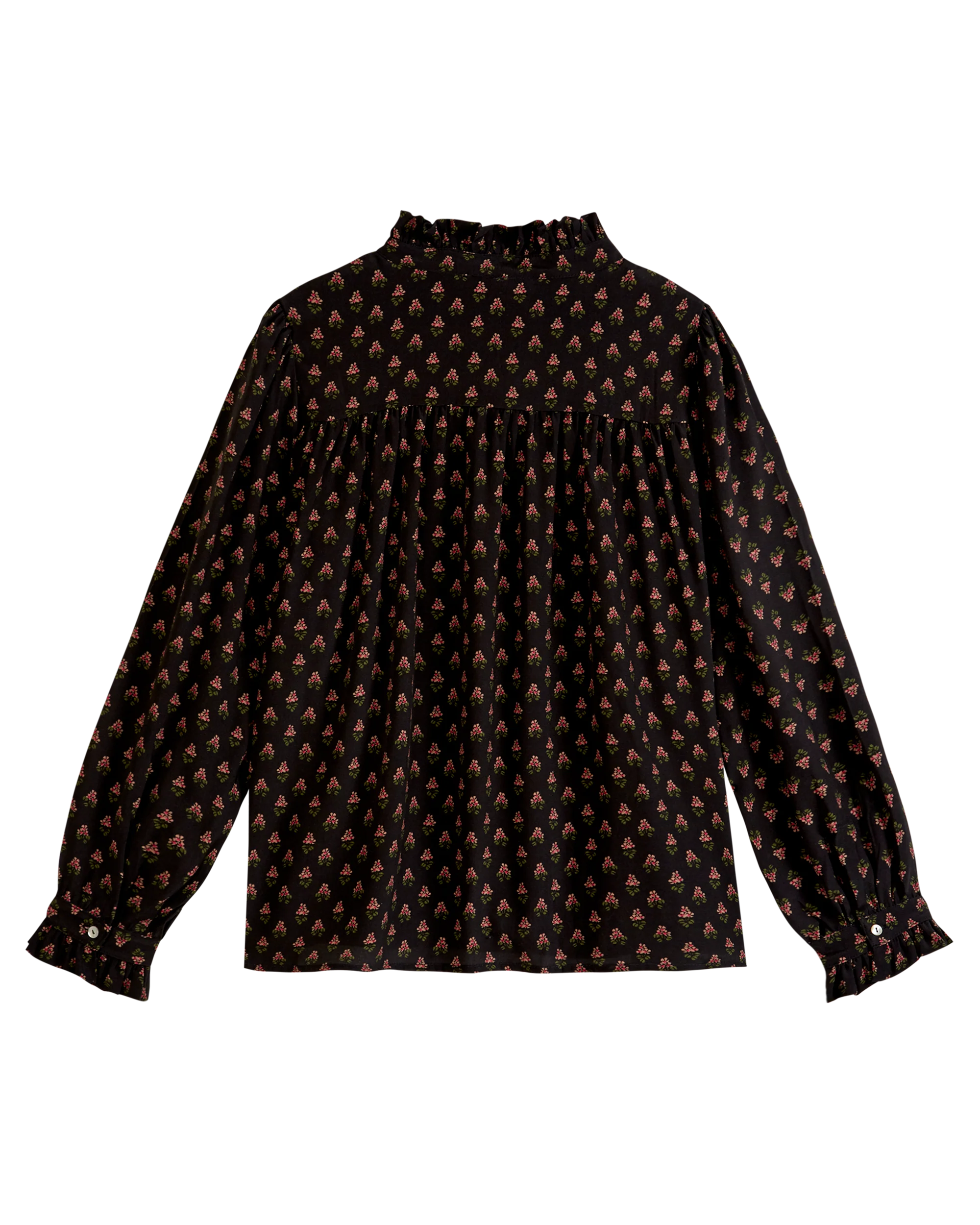 Blouse en viscose imprimée de grappes roses sur fond bleu marine. Le devant de la blouse à la coupe ample contraste avec le dos dont les fronces sont retenues par un empiècement. Le froufrou qui surmonte le pied de col se retrouve tout le long de la patte de boutonnage dissimulant les boutons en nacre naturelle et termine aussi les larges manches longues.