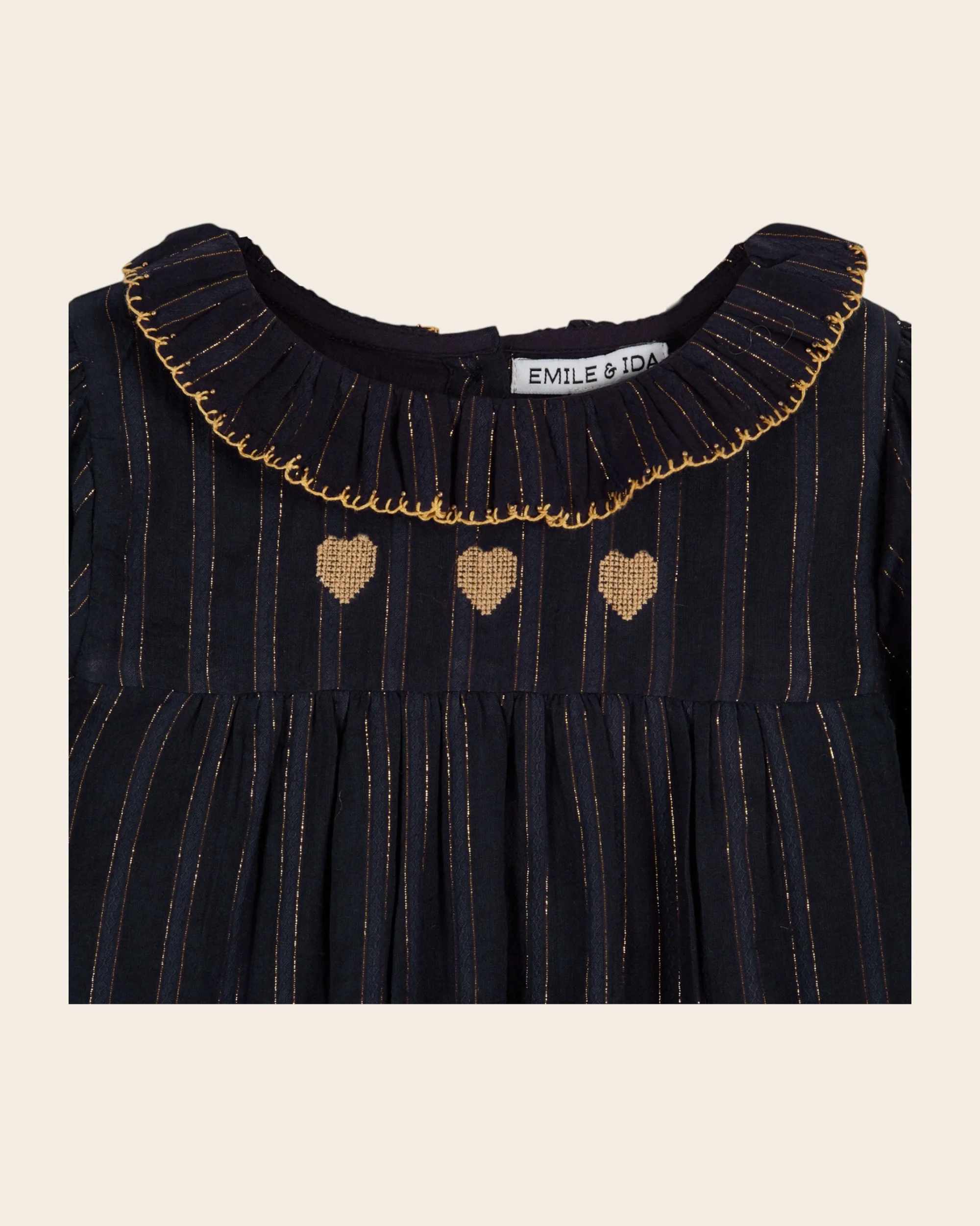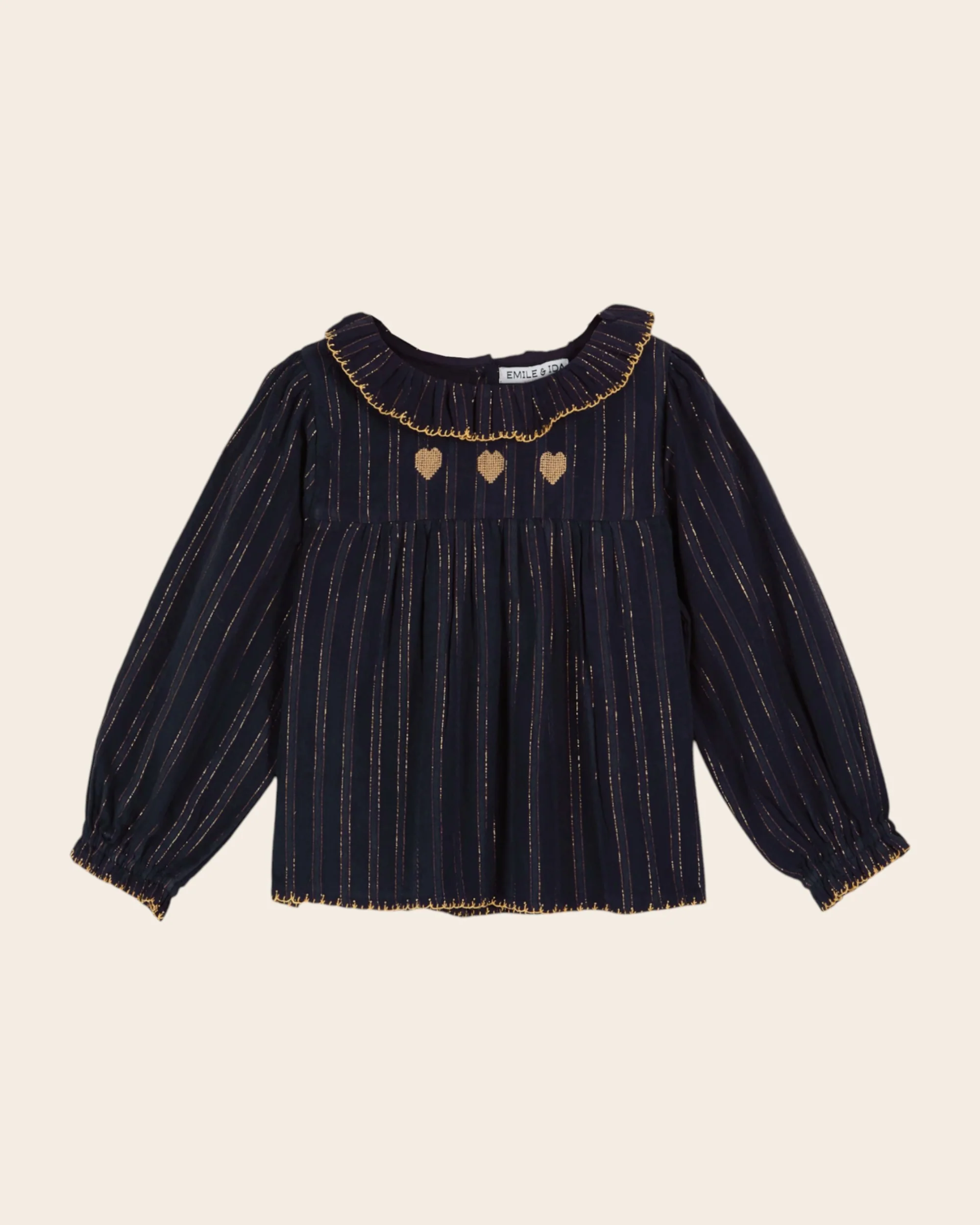 Blouse en coton bleu nuit. Elle est confectionnée dans un magnifique tissu texturé composé de fils en lurex doré et de broderies coeur.