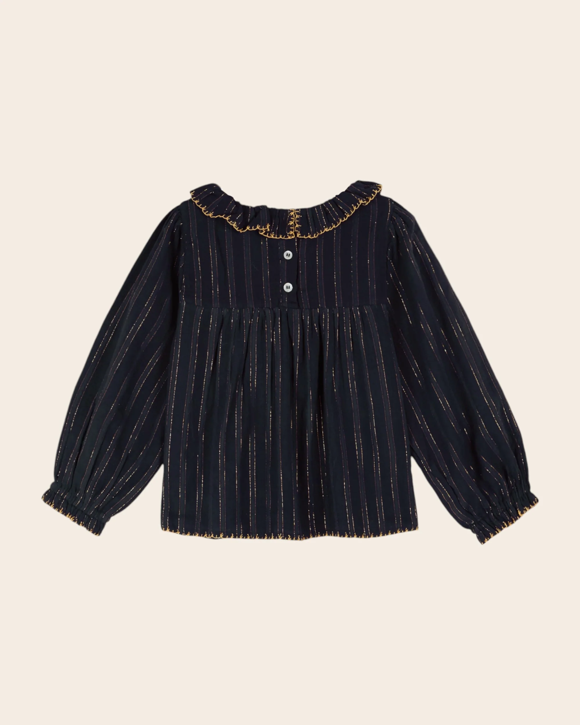 Et pour parfaire la blouse des broderies en fils doré bordent la collerette, le volant des poignets et la base.