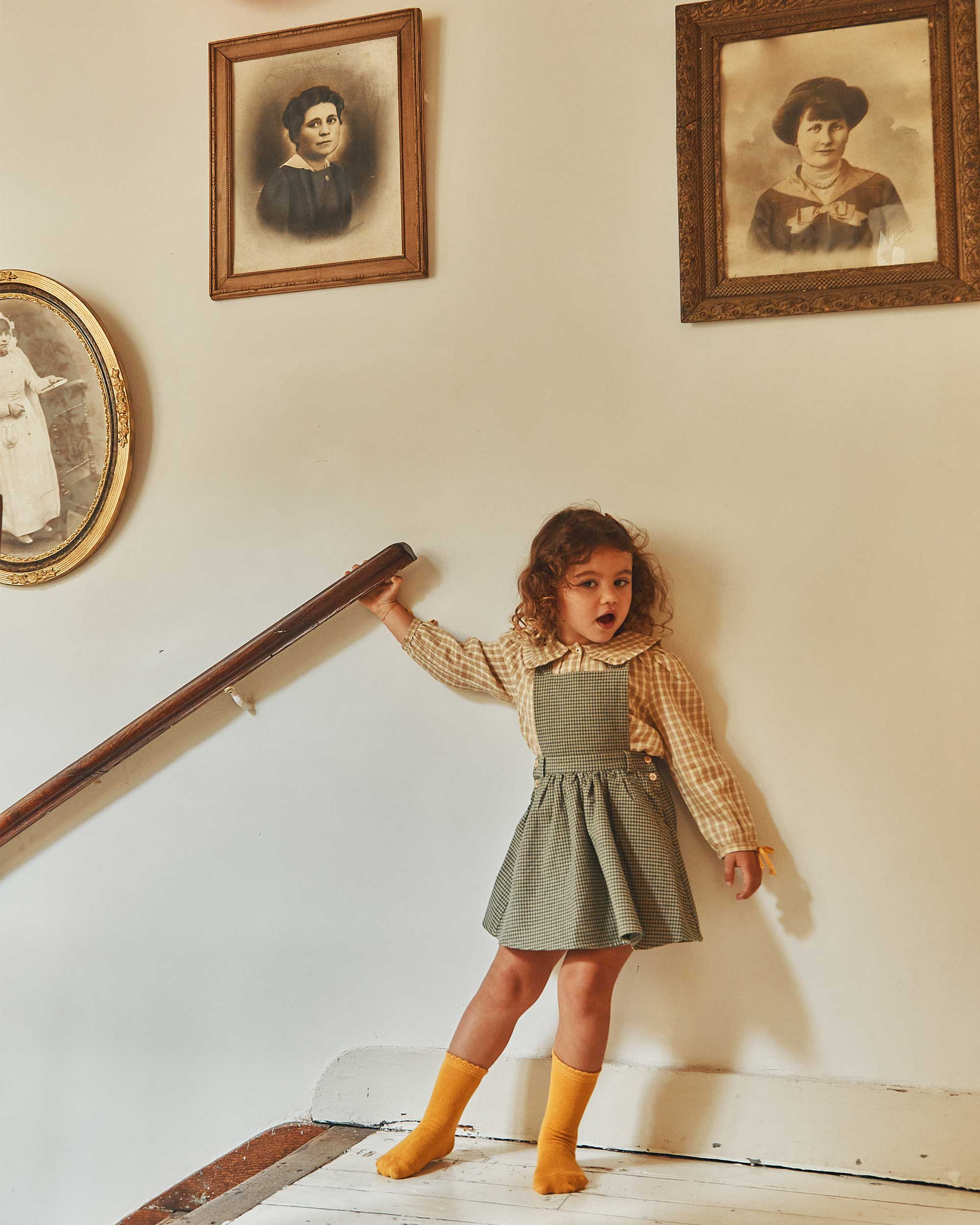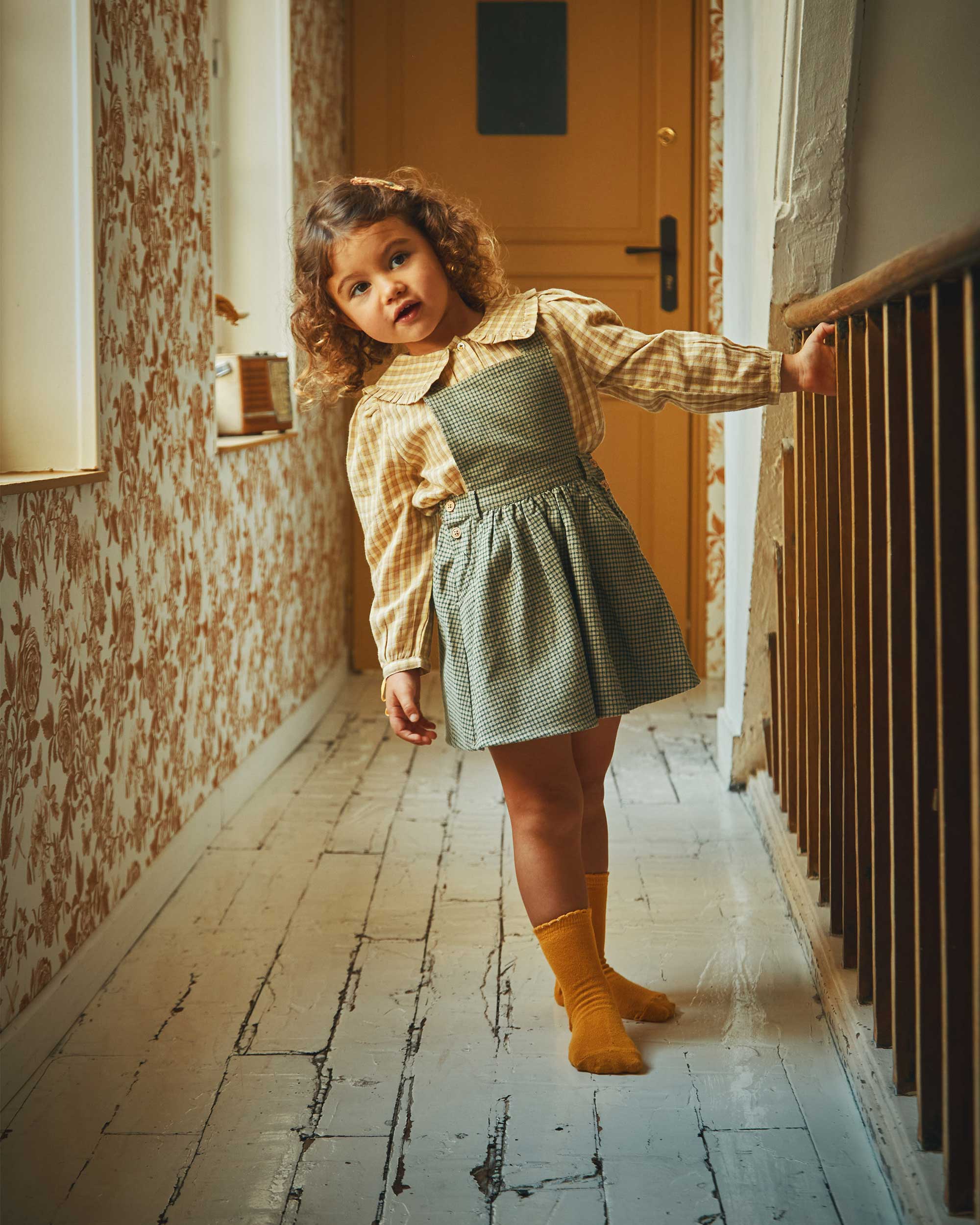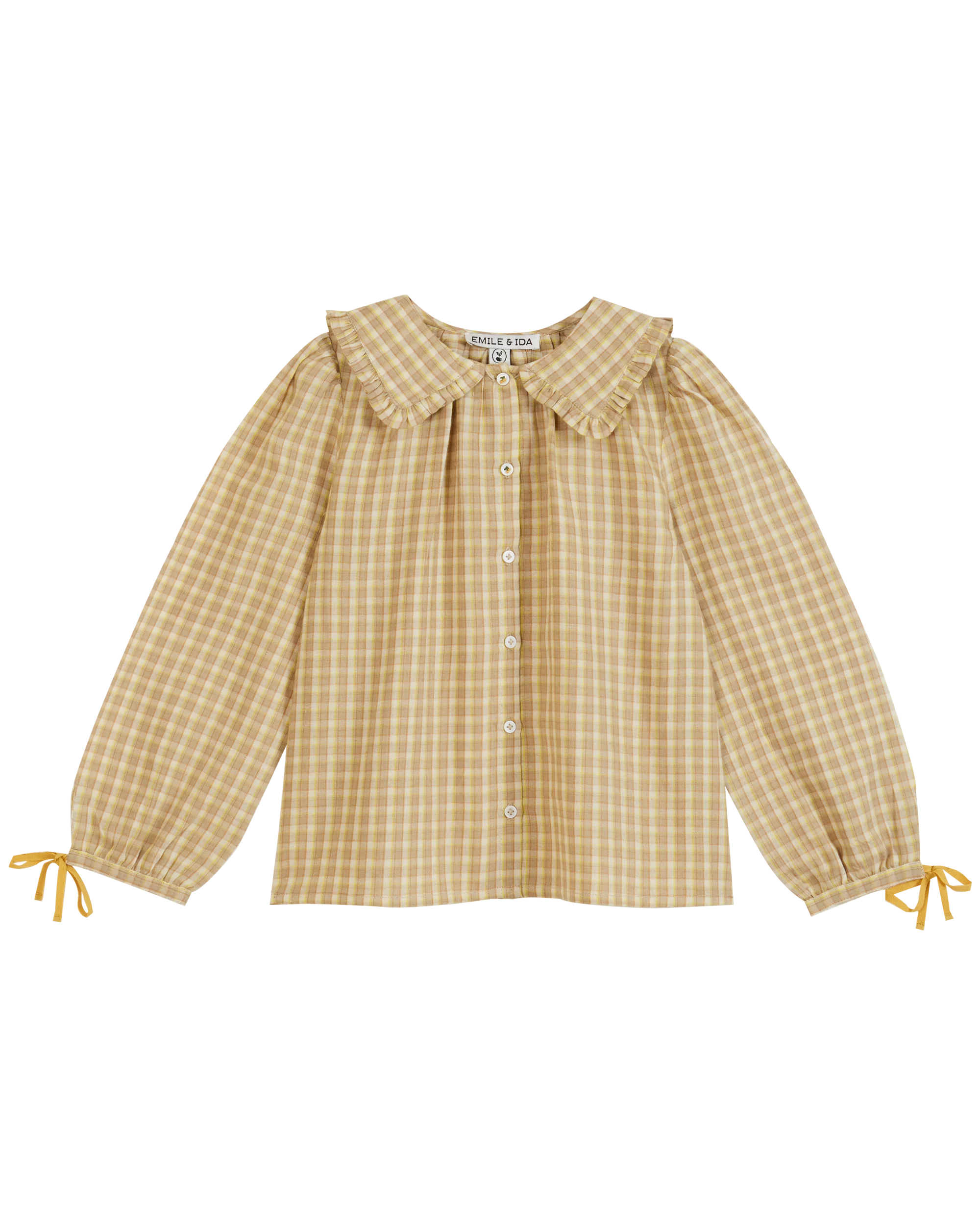 Coupe évasée dont l’ampleur est renforcée par les quelques fronces autour de l’encolure, large col inspiré des cols marins et bordé d’un volant, manches longues joliment finies aux poignets avec un nœud en sergé de coton jaune et bien évidemment boutons en nacre naturelle. Un chemisier chic et confortable qui laisserait croire que les petites filles sont toujours sages.