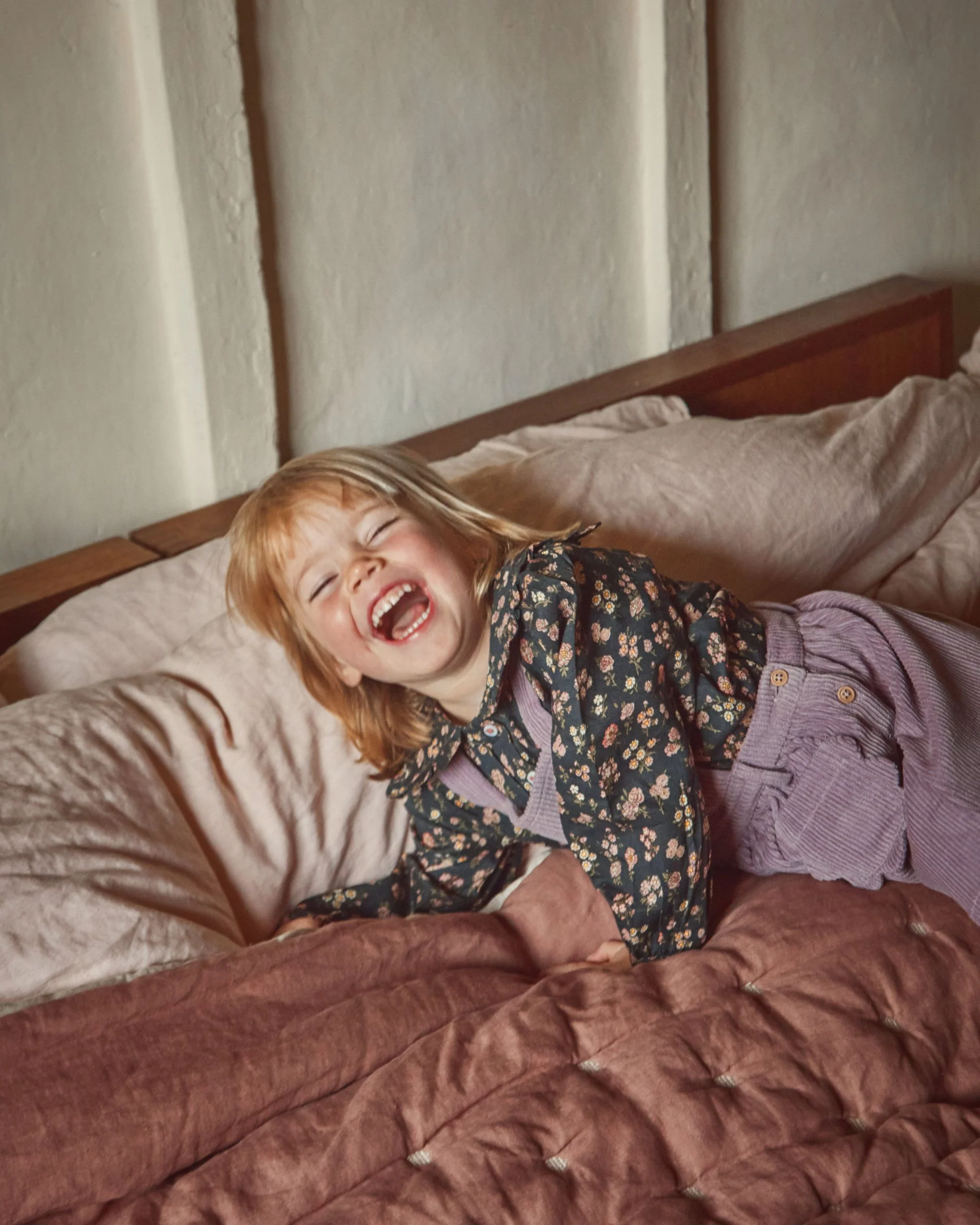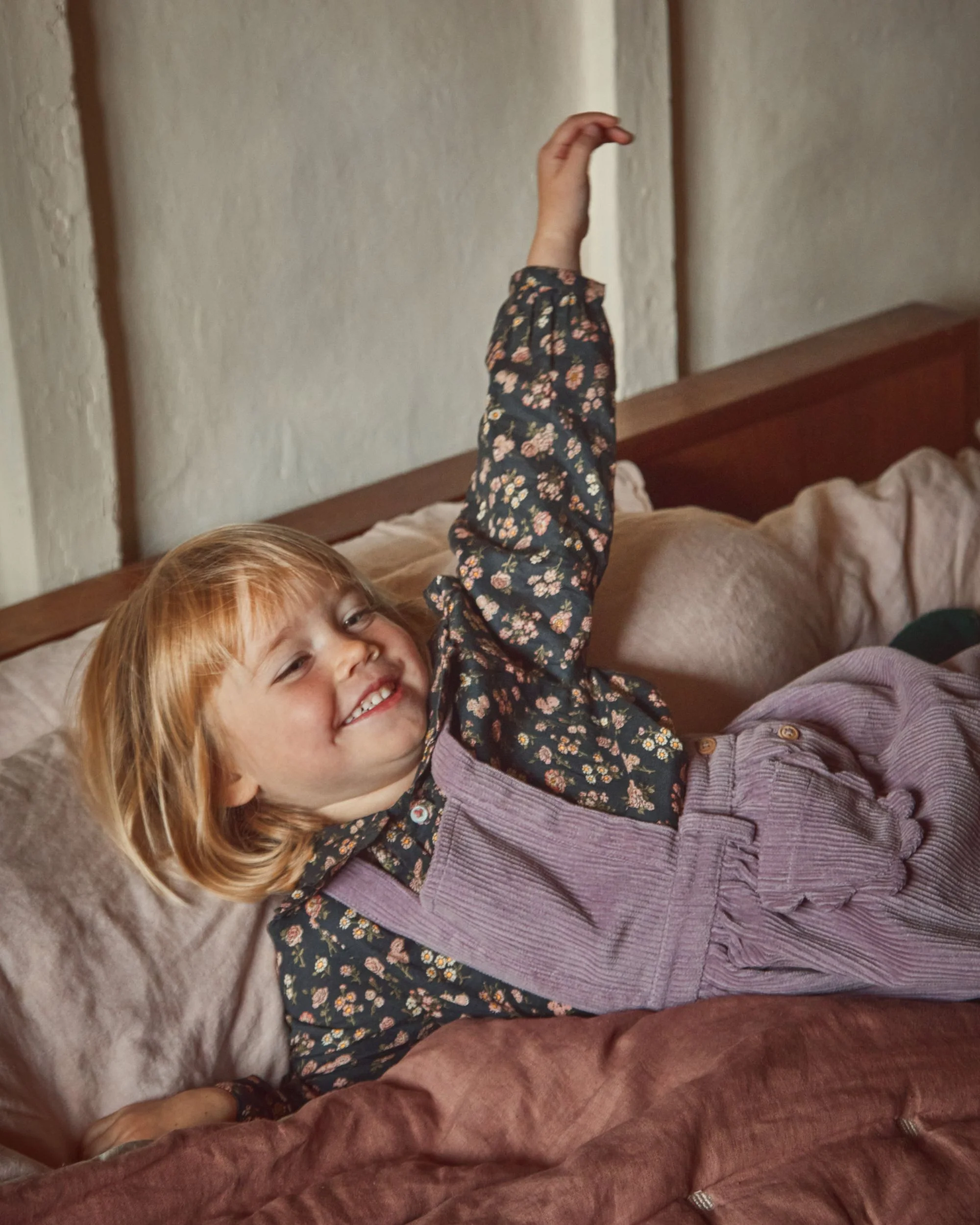 Coupe évasée dont l’ampleur est renforcée par les quelques fronces autour de l’encolure, large col inspiré des cols marins et bordé d’un volant, manches longues resserrées aux poignets et bien évidemment boutons en nacre naturelle. Un chemisier chic et confortable qui laisserait croire que les petites filles sont toujours sages.
