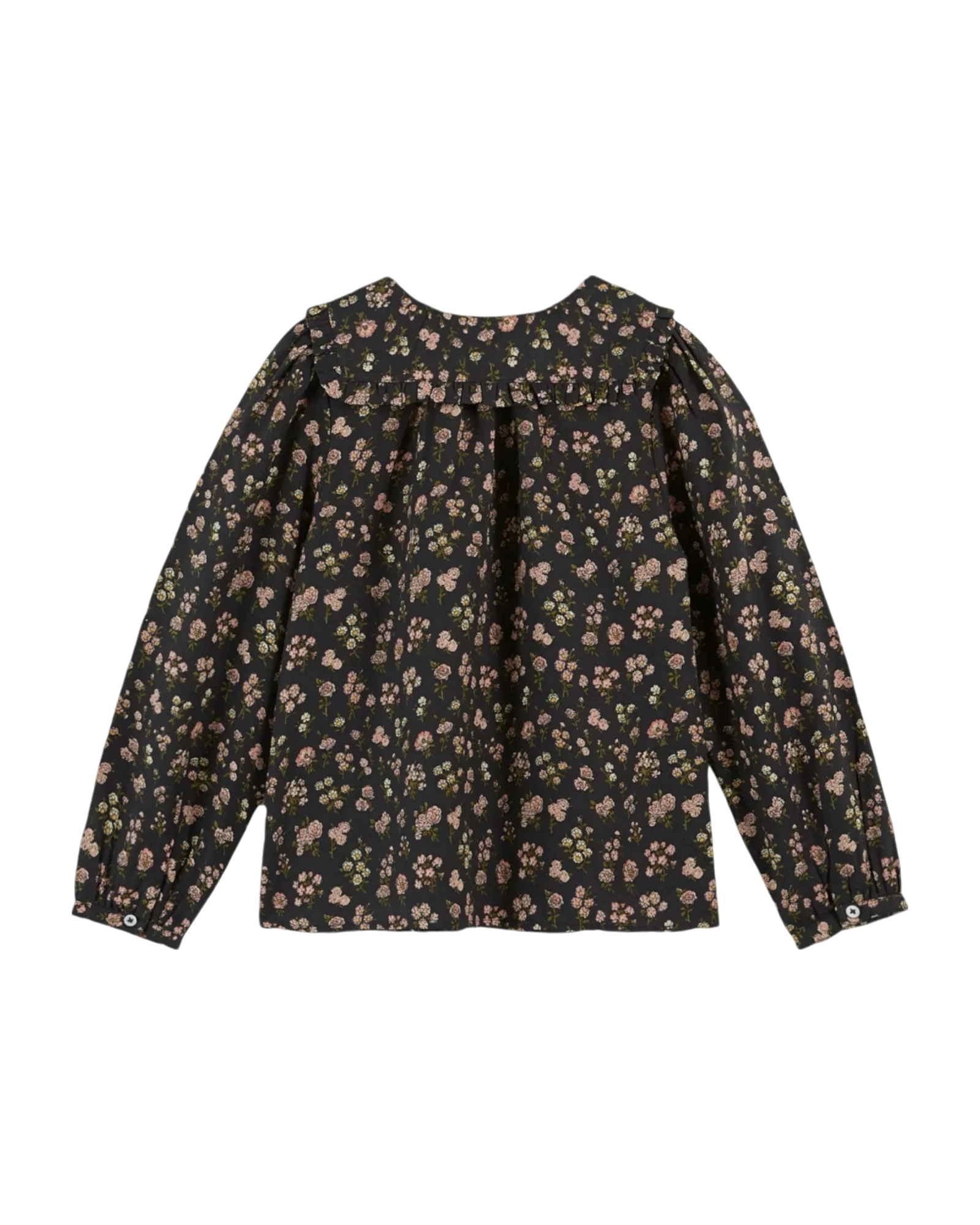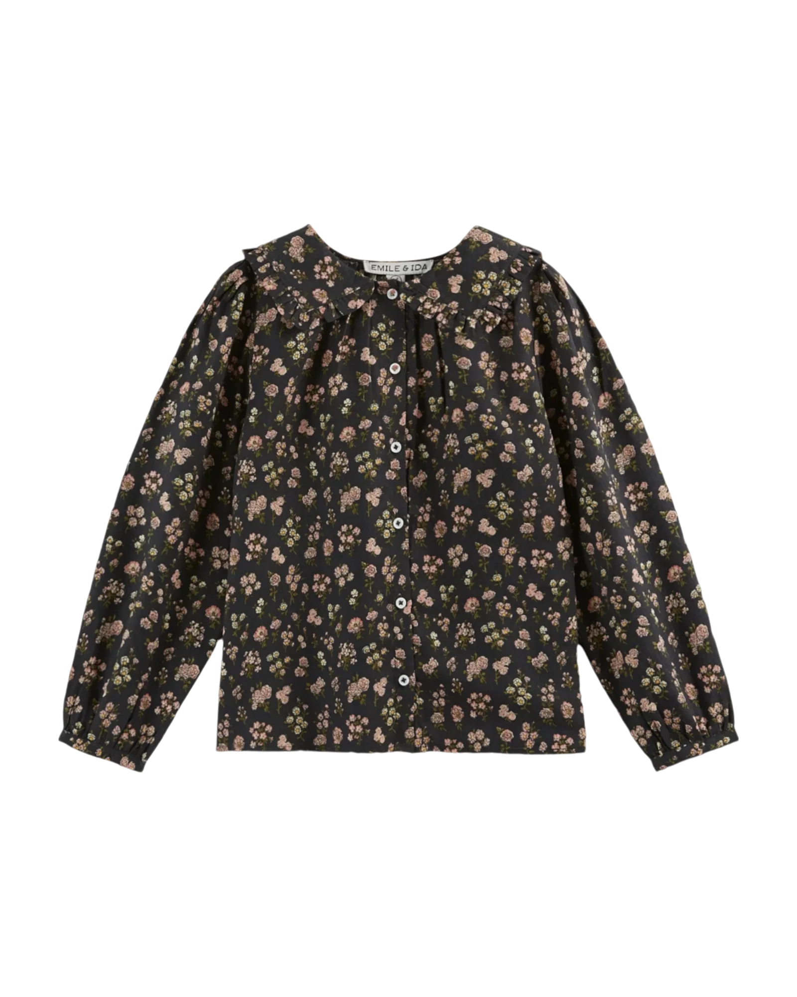 Blouse en coton dont le fond noir est parsemé de fleurs roses et blanches.