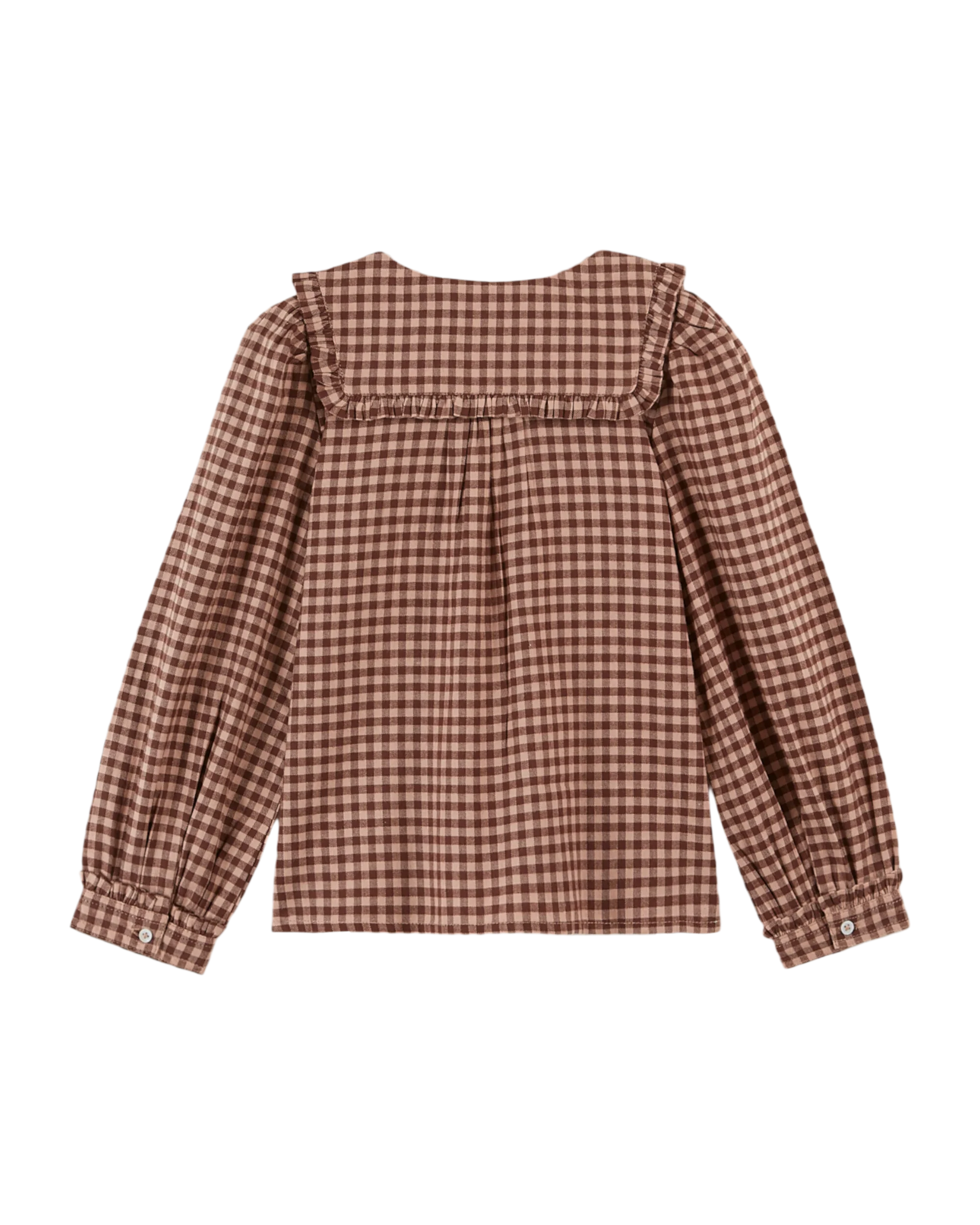 Blouse en coton vichy rose et écru. À l’inverse du dos froncé juste sous l’encolure, le devant de la blouse est délicatement travaillé. Des plis couchés soutenus par un empiècement rythment toute la hauteur et la largeur de la blouse. Ils sont cousus, jusque sous la poitrine puis reprennent leur liberté pour fournir de l’ampleur […]