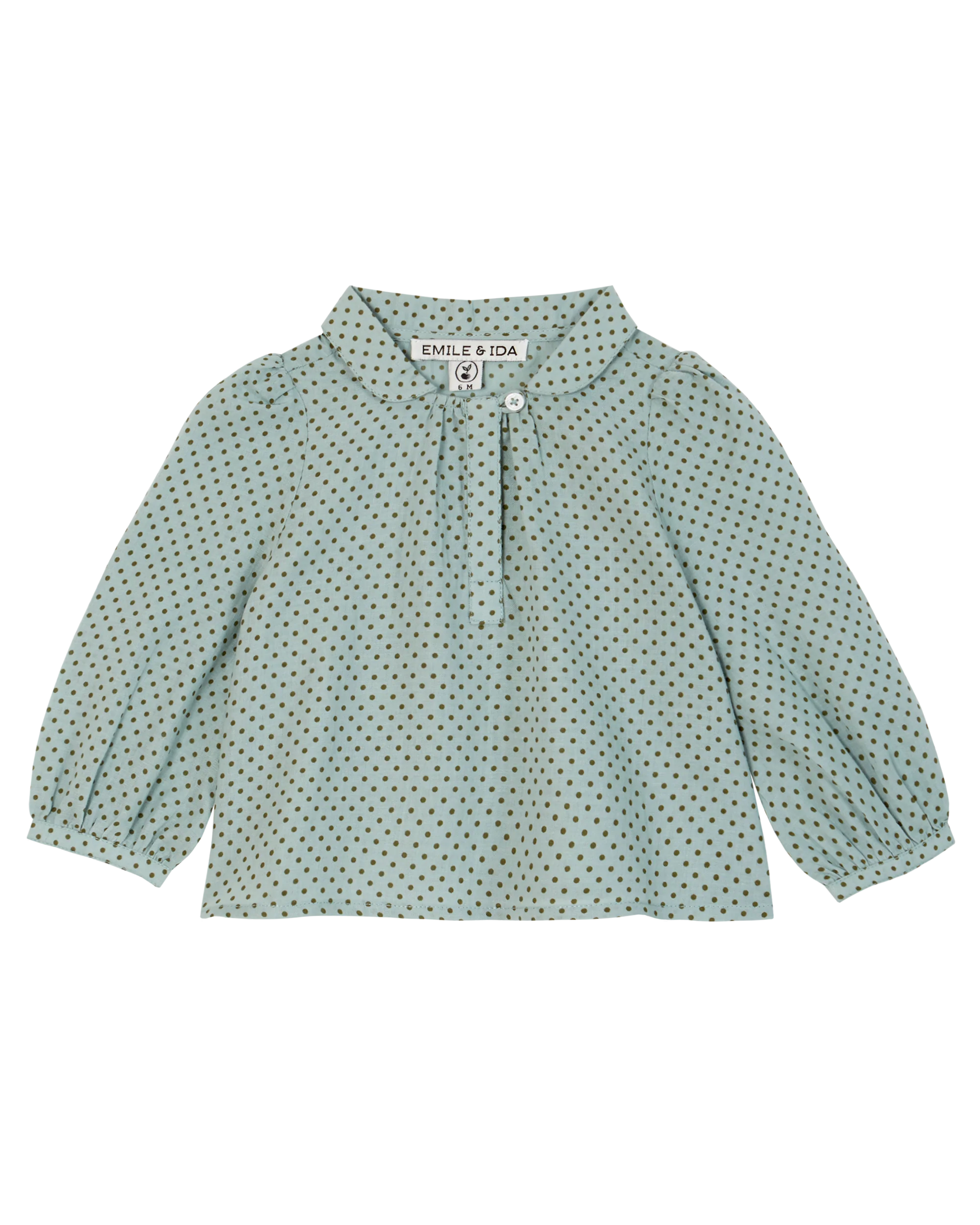 Blouse en coton céladon parsemé de petits pois noirs. Et quand les pois sont noirs, ça change des poissons rouges ! Et même si on ne pêche pas il est possible de porter cette blouse dont la forme évasée, renforcée par des fronces autour de l’encolure ras du cou, laisse une grande amplitude aux mouvements des petites filles. Manches longues resserrées aux poignets, fente sur le devant qui se ferme, comme les poignets, avec un bouton en nacre naturelle et petit col Claudine.