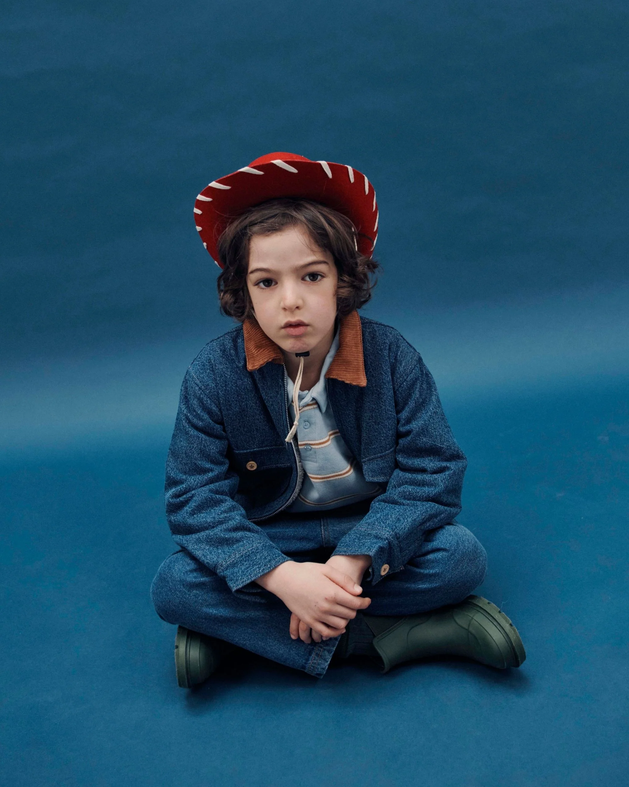 Blouson en coton denim bleu doublé en fourrure synthétique écru. – Col pointu en velours côtelé caramel – Fermeture à glissière en métal – Manches longues boutonnées aux poignets – Poches plaquées à rabat – Ceinture élastiquée