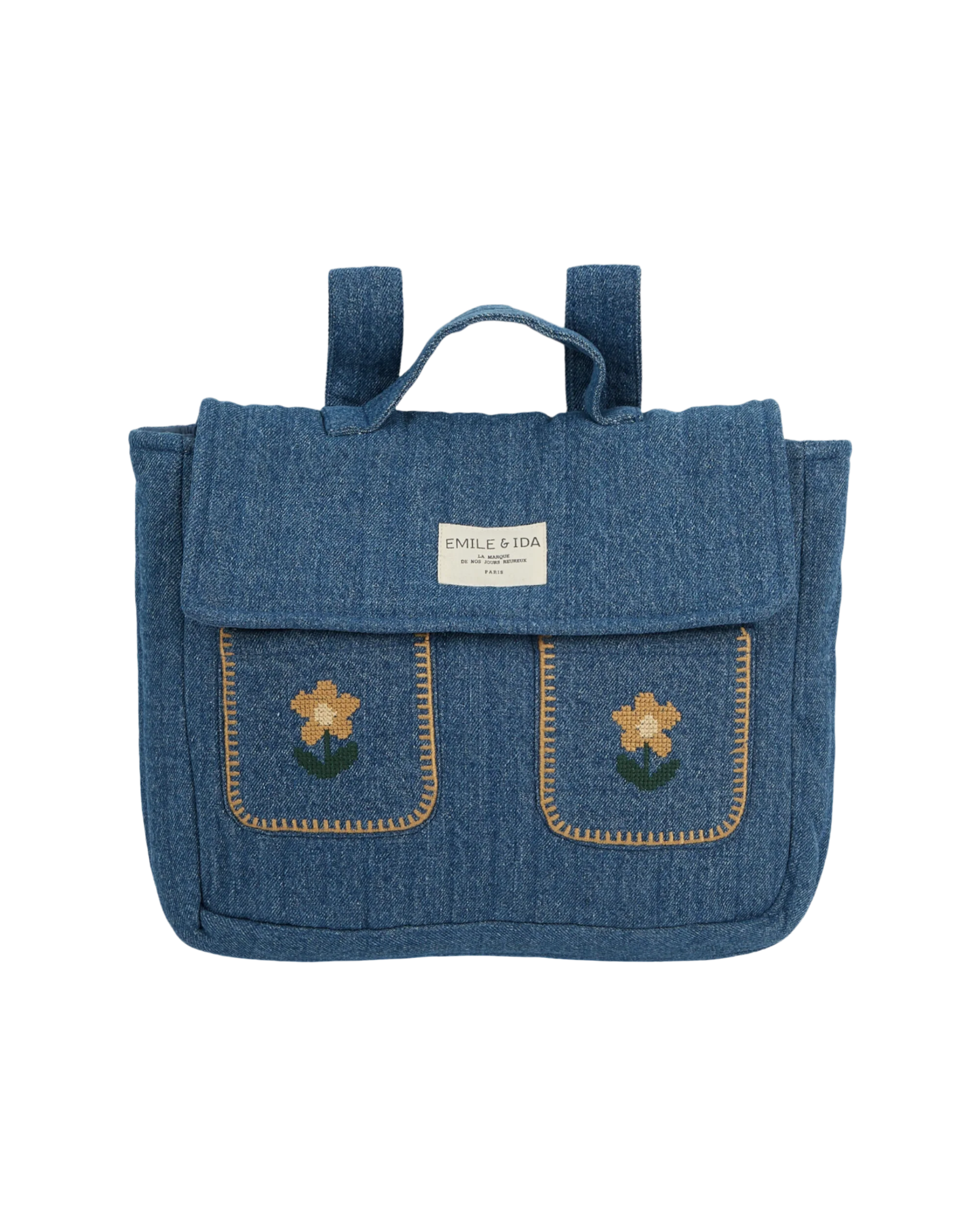 Cartable en coton denim bleu matelassé avec une poignée, des bretelles réglables et des fermetures en métal par boutons pressions. On y glisse de petits cahiers, quelques affaires de rechange ou son livre de bibliothèque. Dans les 2 poches de devant brodées de fleurs au point de croix, on range d’un côté une collation, de l’autre… ses trésors !