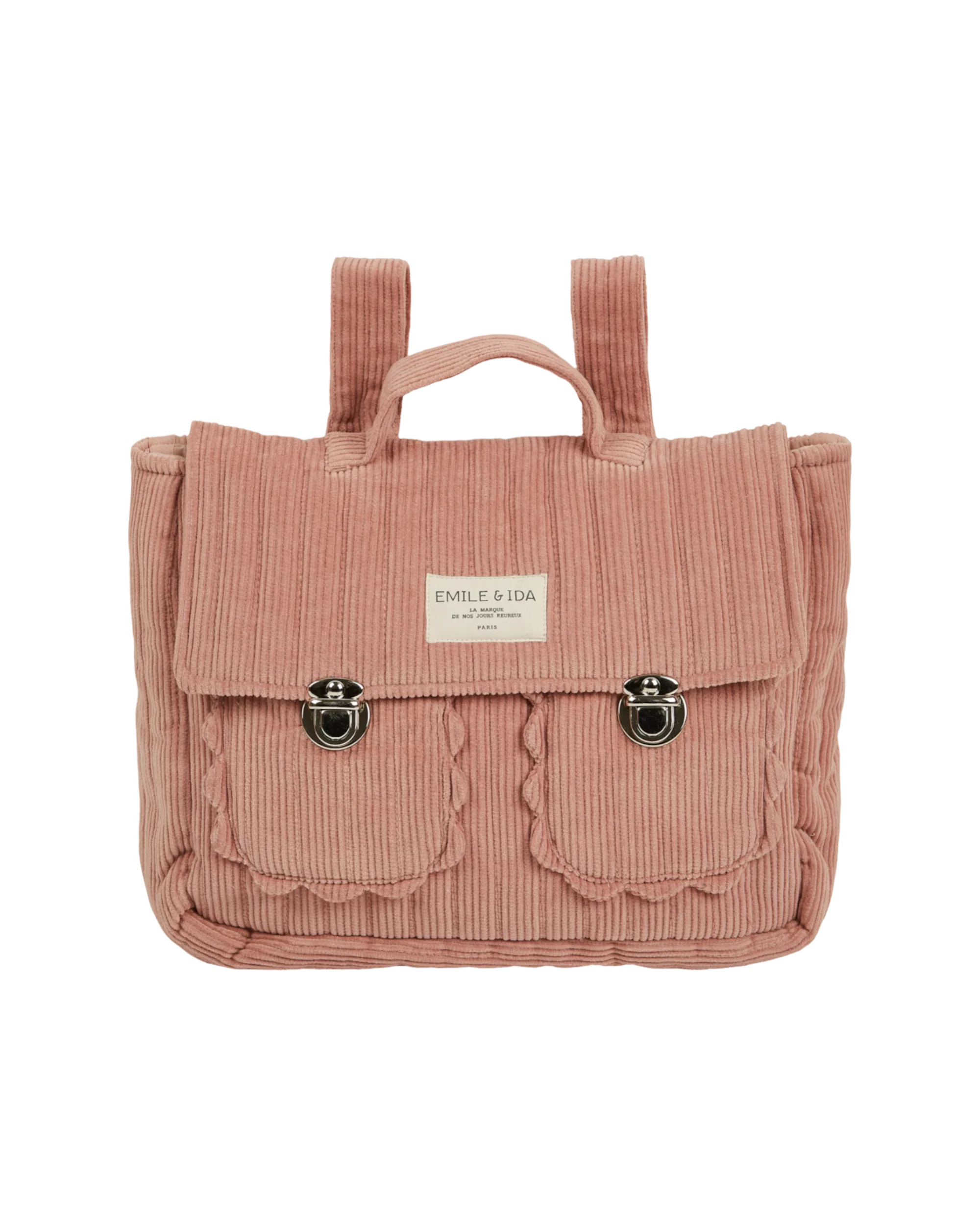 Cartable en velours de coton côtelé et matelassé rose avec une poignée, des bretelles réglables et des fermetures en métal. On y glisse de petits cahiers, quelques affaires de rechange ou son livre de bibliothèque. Dans les 2 poches de devant brodées de fleurs au point de croix, on range d’un côté une collation, de l’autre… ses trésors !
