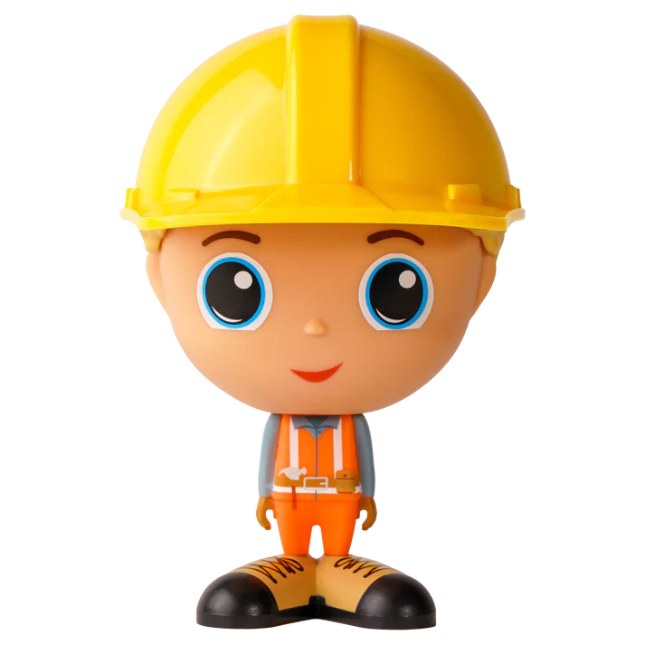 Chaque figurine de construction Flek est prête à travailler avec son casque jaune et ses bottes de chantier. Ils portent leur ceinture à outils par-dessus leur veste de sécurité et sont prêts à construire.