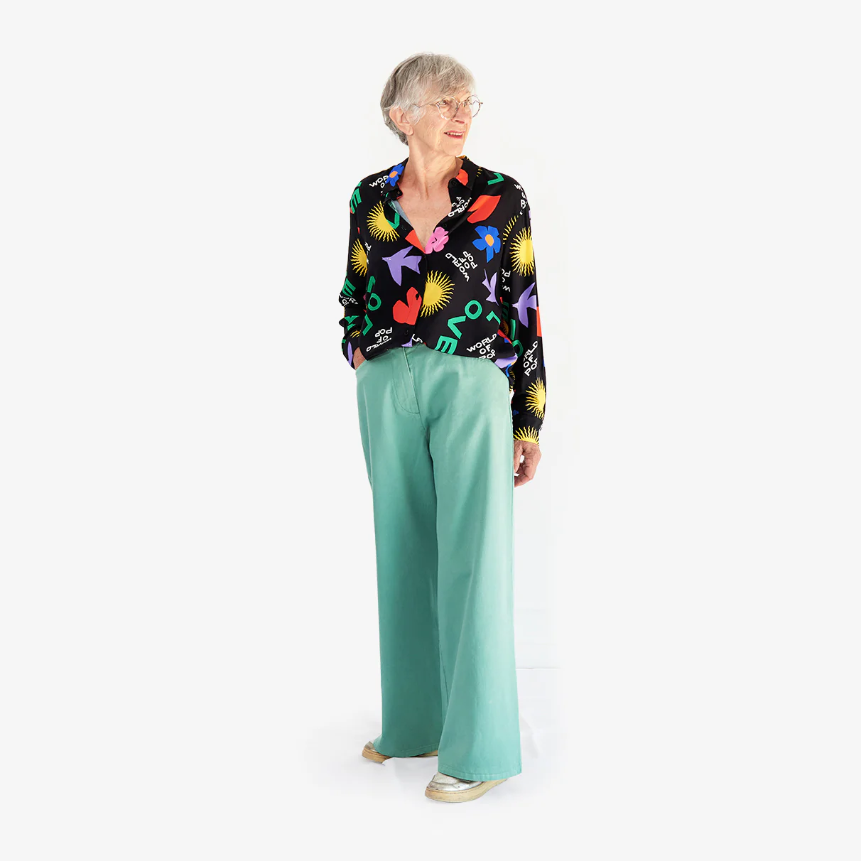 Cette chemise en viscose éco-responsable à manches longues arbore un imprimé ludique de « Symboles ».