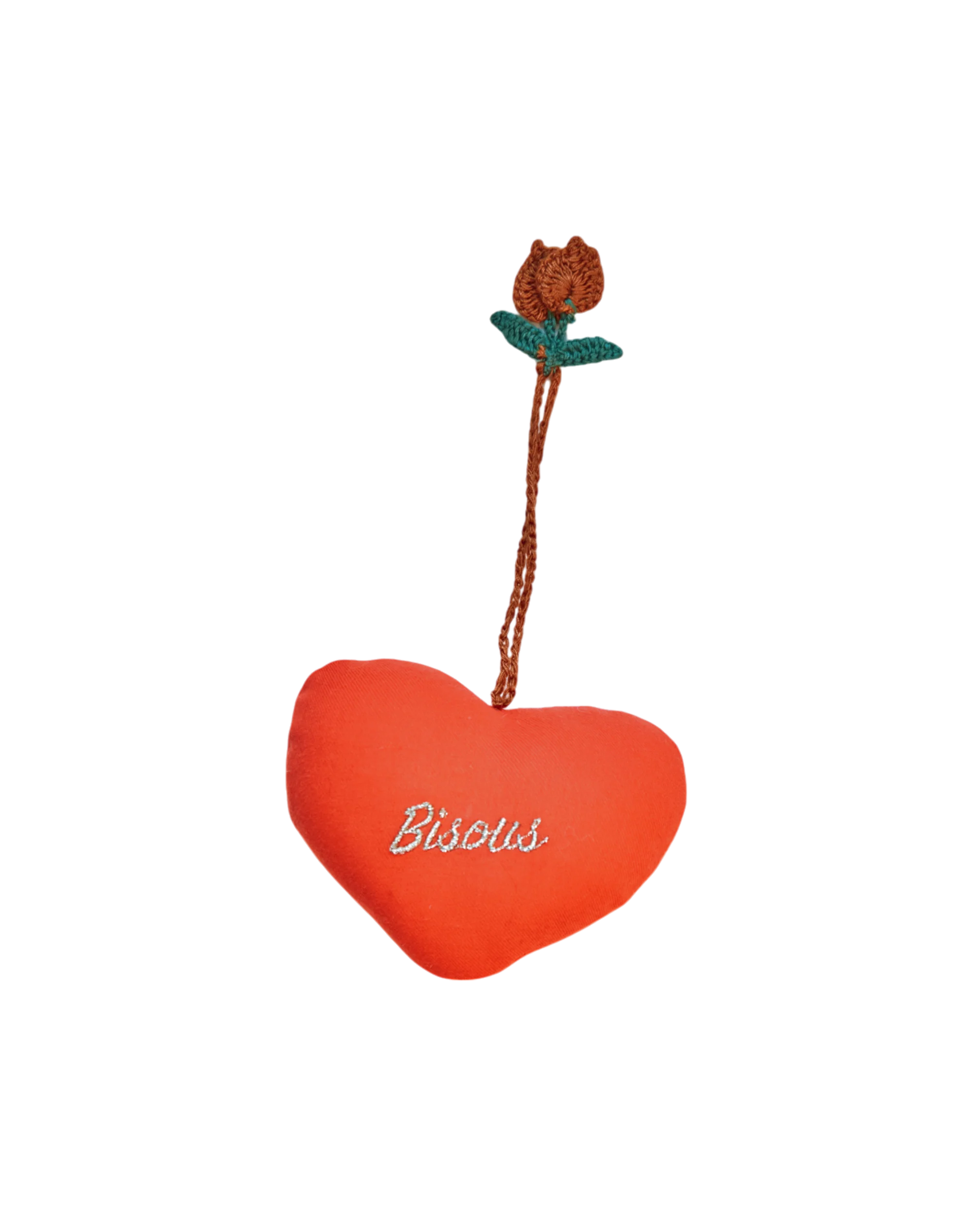 Cœur décoratif à suspendre en coton rouge. Des petites cerises se sont glissées sur l’attache. Il est agrémenté d’une broderie en lurex doré « Bisous ».