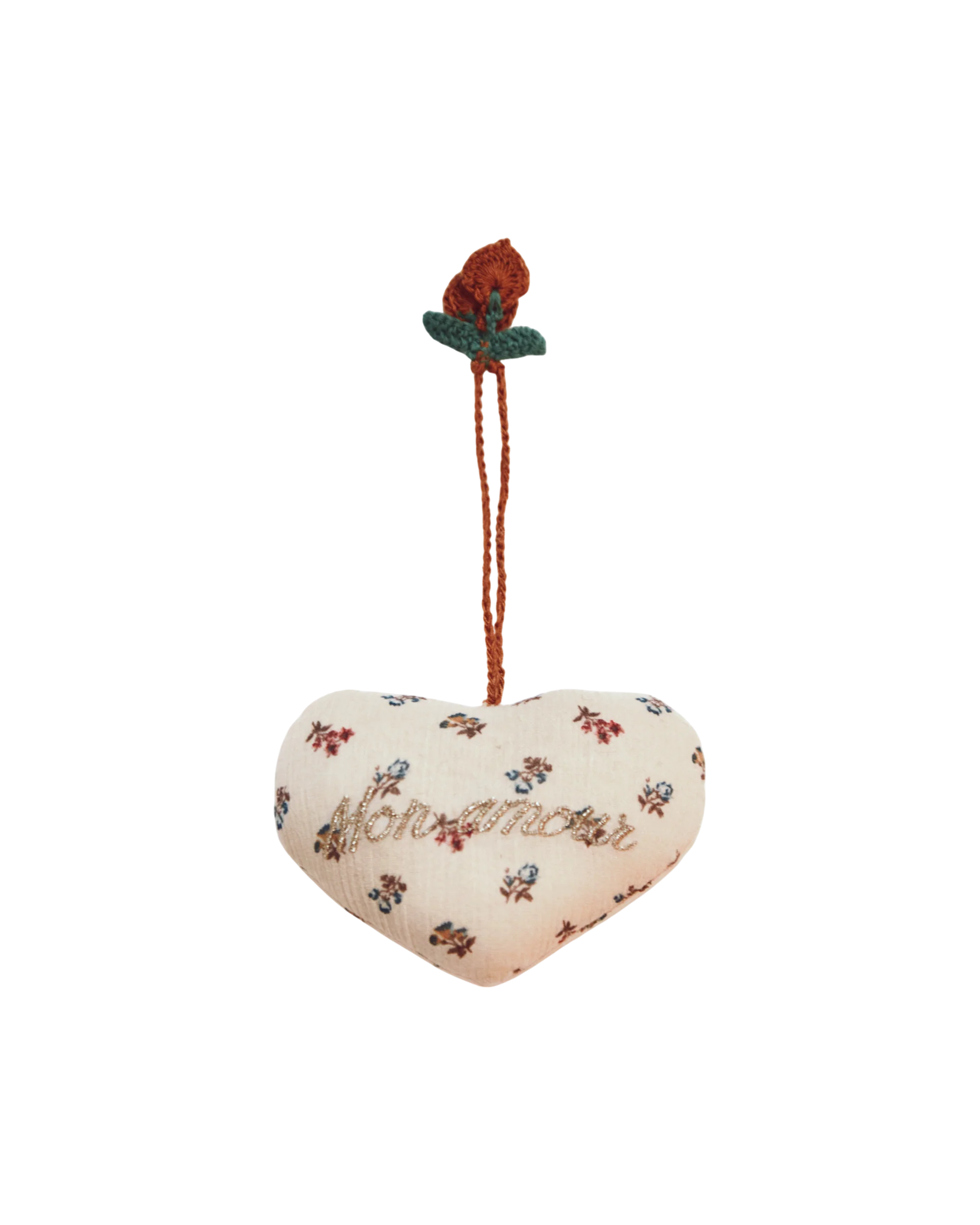 Cœur décoratif en coton créponné écru imprimé en all-over de fleurettes rouges et bleues. Des petites cerises se sont glissées sur l’attache. Il est agrémenté d’une broderie en lurex doré « Mon amour ».