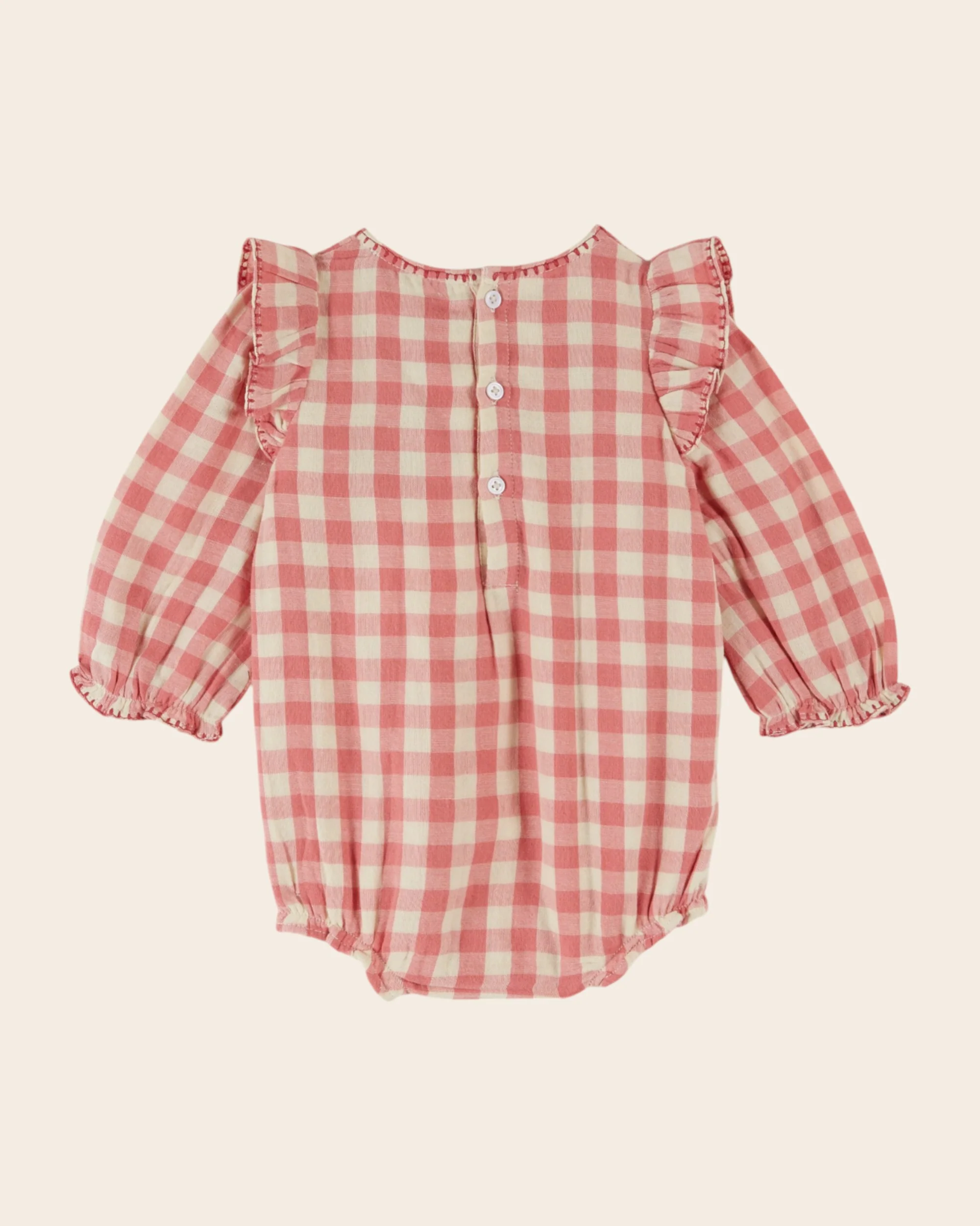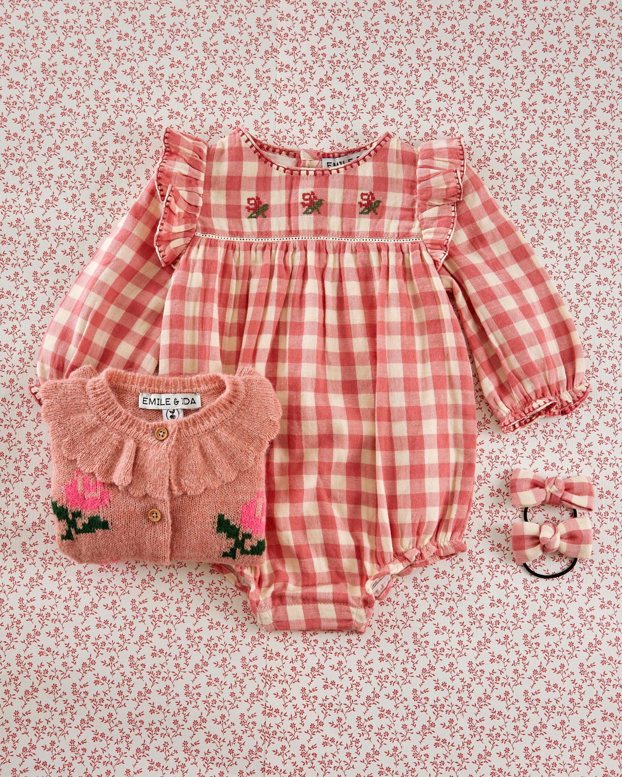 Combibloomer en coton tout doux vichy rose et écru. Il est agrémenté par des points de broderie rose tyrien et des fleurs brodées au point de croix par des artisans indiens.
