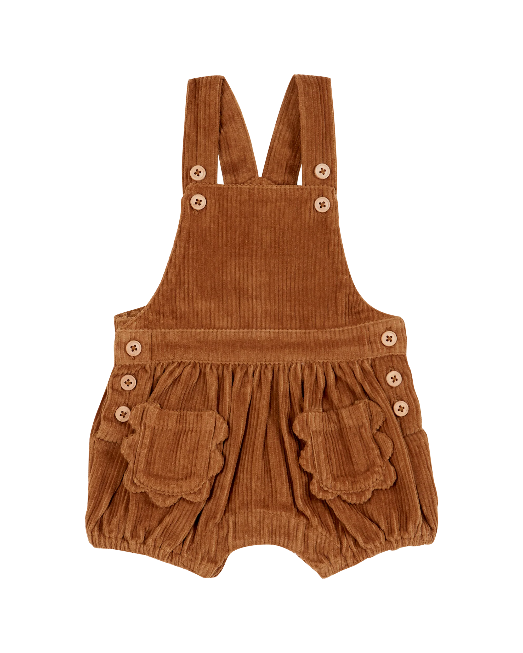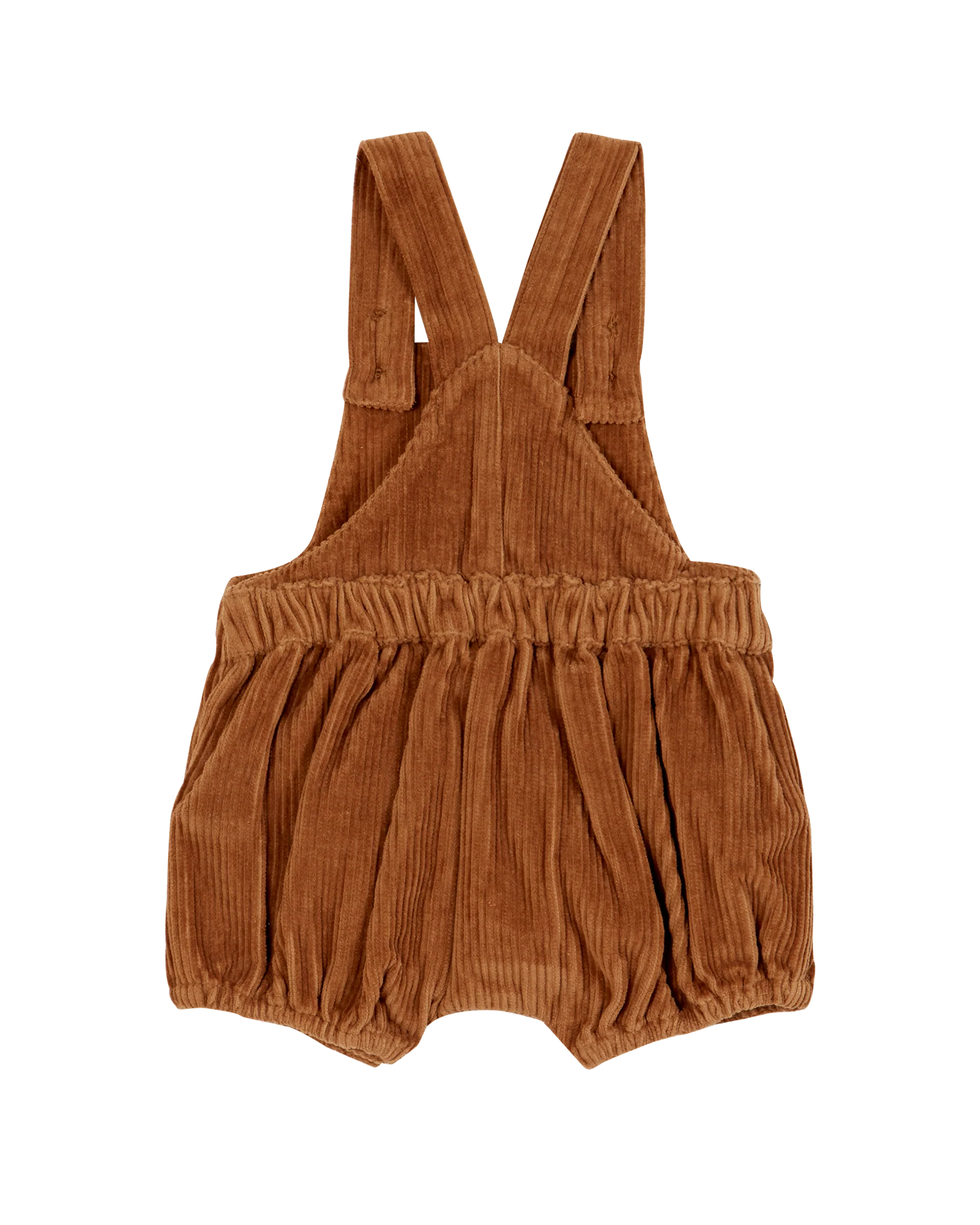 Combibloomer en velours de coton marron glacé. Des grosses côtes tout en douceur qui transforment les bébés en doudou tout doudoux. Les bavettes doublées sont montées sur une ceinture, élastiquée dans le dos et les bretelles en Y qui les relient se règlent avec des boutons car cela vous permet de les adapter au plus juste à la taille de votre petit. Des surpiqûres soulignent et renforcent les deux poches fleur plaquées et les bords des bavettes. Comme sur une salopette, une fente avec ses boutons en bois de chaque côté permet d’enfiler le combibloomer sans difficulté.