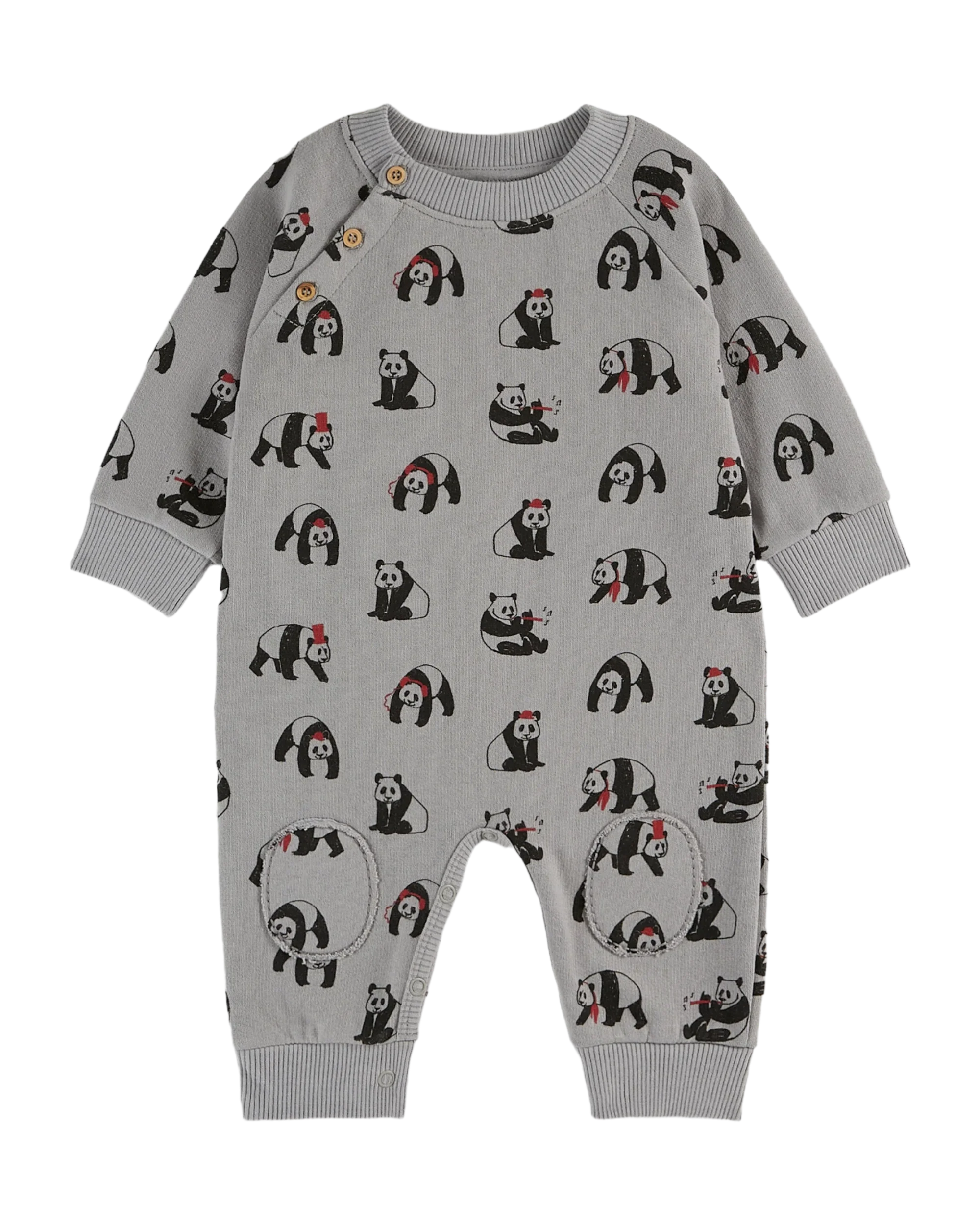 Combinaison en coton biologique molletonné et gratté gris sur lequel des pandas facétieux font les polissons. L’un joue de la flûte, un autre écoute de la musique quand un troisième se balade.