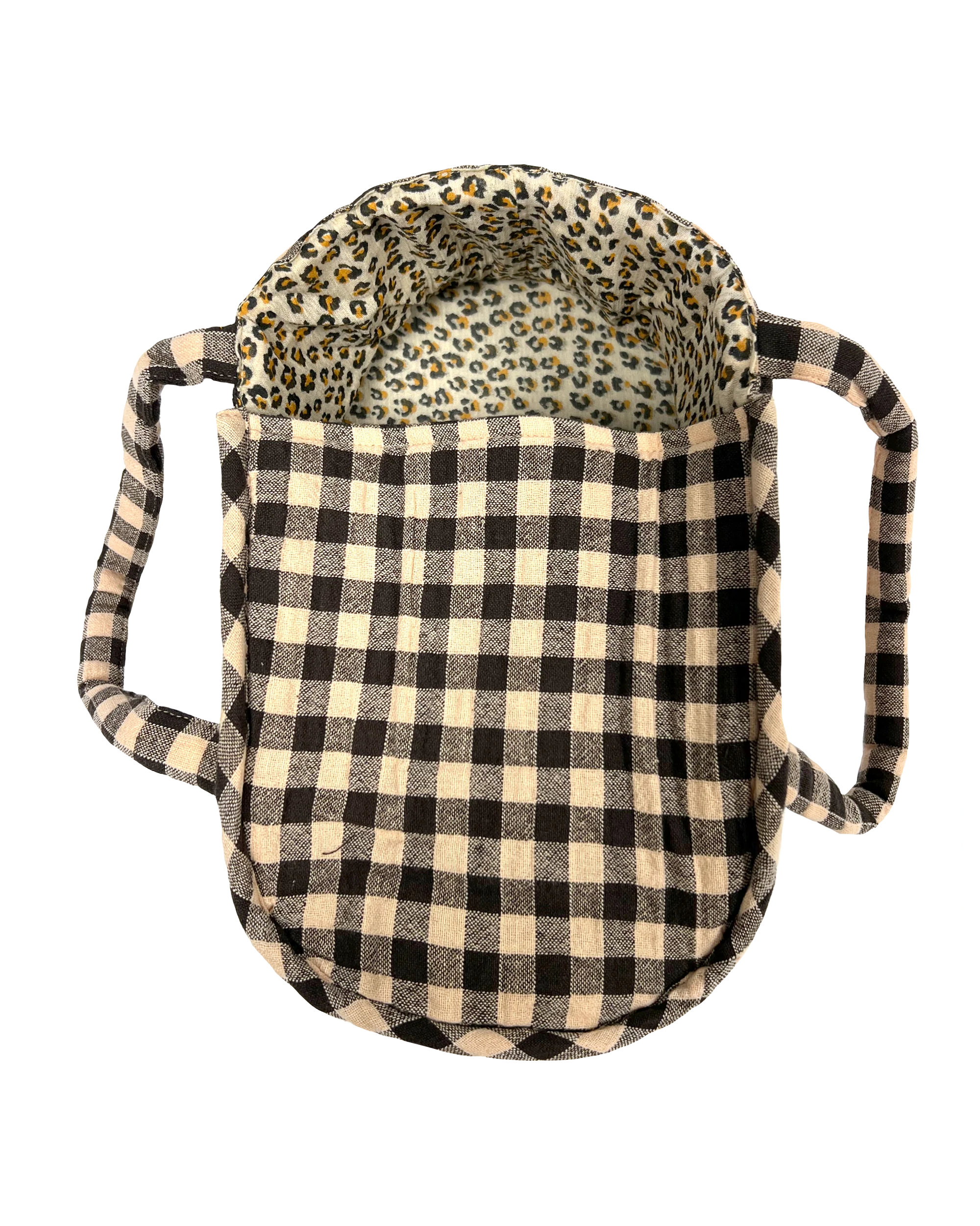 Le couffin en coton imprimé vichy café est spécialement conçu pour promener le bébé de votre enfant dans un grand confort. C’est l’heure de la balade pour bébé : la petite maman l’habille, le glisse dans la gigoteuse, le pose délicatement dans le couffin. Elle enfile son manteau et ses chaussures, attrape les deux anses et hop, c’est parti pour une belle balade à travers son imagination.