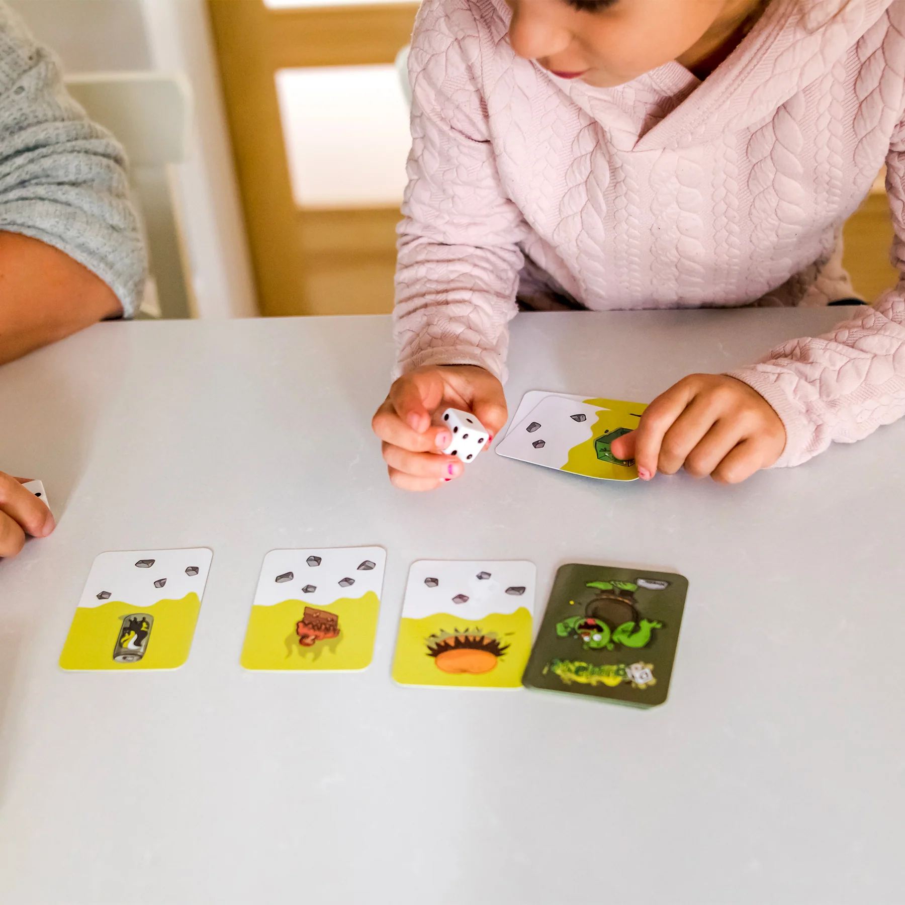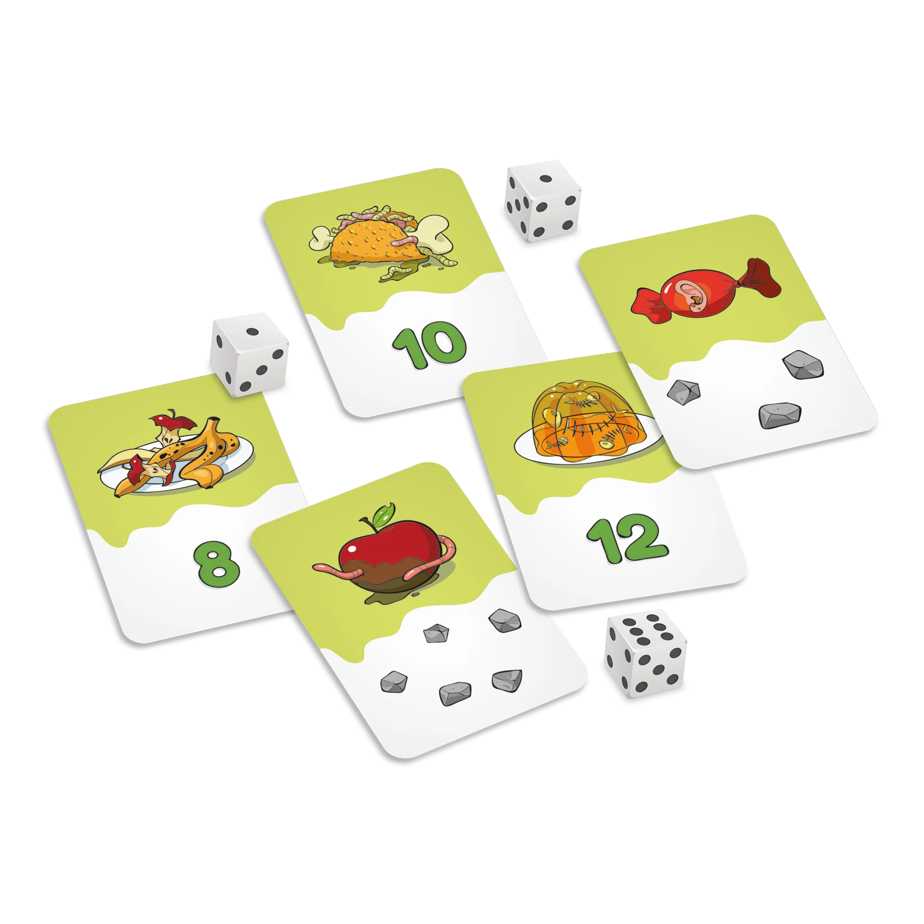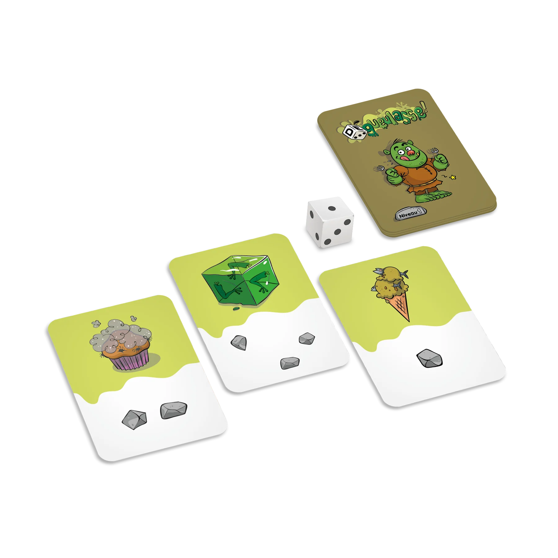 Apprivoise le plus d’ogres possible en leur offrant des collations à leur gout! Pour ce faire, tu dois obtenir, avec un ou deux dés, un nombre qui correspond à celui sur la carte de l’ogre. Montre tes talents de cuisinier et deviens le maitre de ces adorables ogres de compagnie!