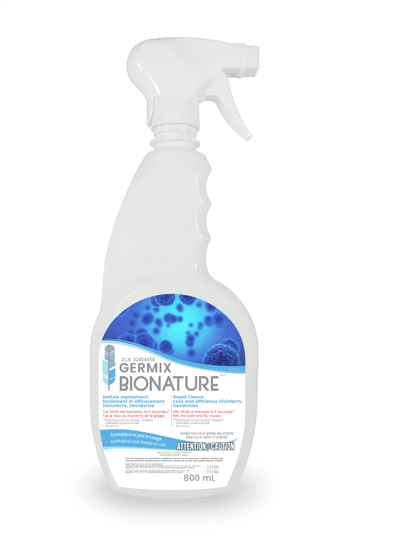 Le nettoyant désinfectant GERMIX détruit 99,9 % des bactéries* en 5 secondes. Utile sur toutes surfaces non poreuses. Conçu pour désinfecter, éliminer les mauvaises odeurs et désincruster les souillures telles que : saleté, sang, urine, excréments, etc. Il est recommandé d’utiliser le nettoyant désinfectant GERMIX dans les résidences, les services de garde, les épiceries, les pouponnières, les écoles, les centres d’entrainement, les salons de coiffure, les vétérinaires, les chenils, les centres dentaires, les centres médicaux, les abattoirs, les porcheries, etc.