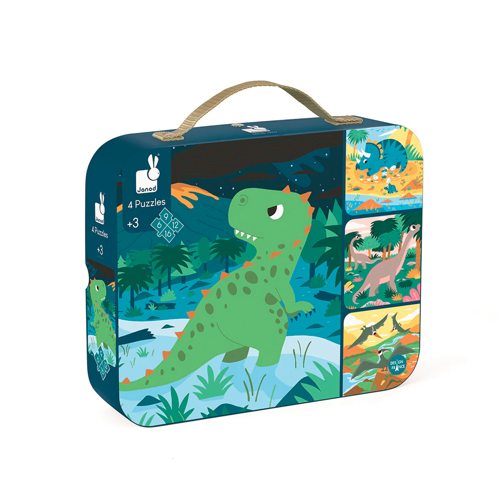 Découvrez quatre puzzles en carton captivants sur le thème des dinosaures! Chaque puzzle présente une couleur différente au dos pour aider votre enfant à assortir les bonnes pièces. Avec un nombre de pièces évolutif de 6, 9, 12 et 16, ils sont conçus pour accompagner la progression de votre enfant. Les casse-têtes évolutifs de Janod offrent des images vives et stimulantes, idéales pour votre petit explorateur! Présentés dans une jolie valise de rangement en carton avec une poignée en tissu pour un transport facile.