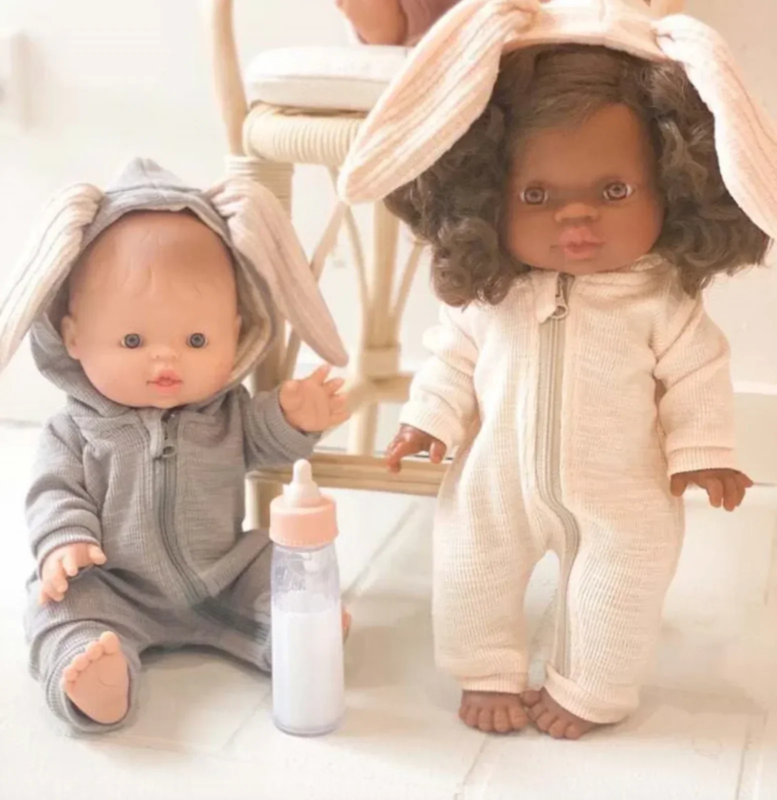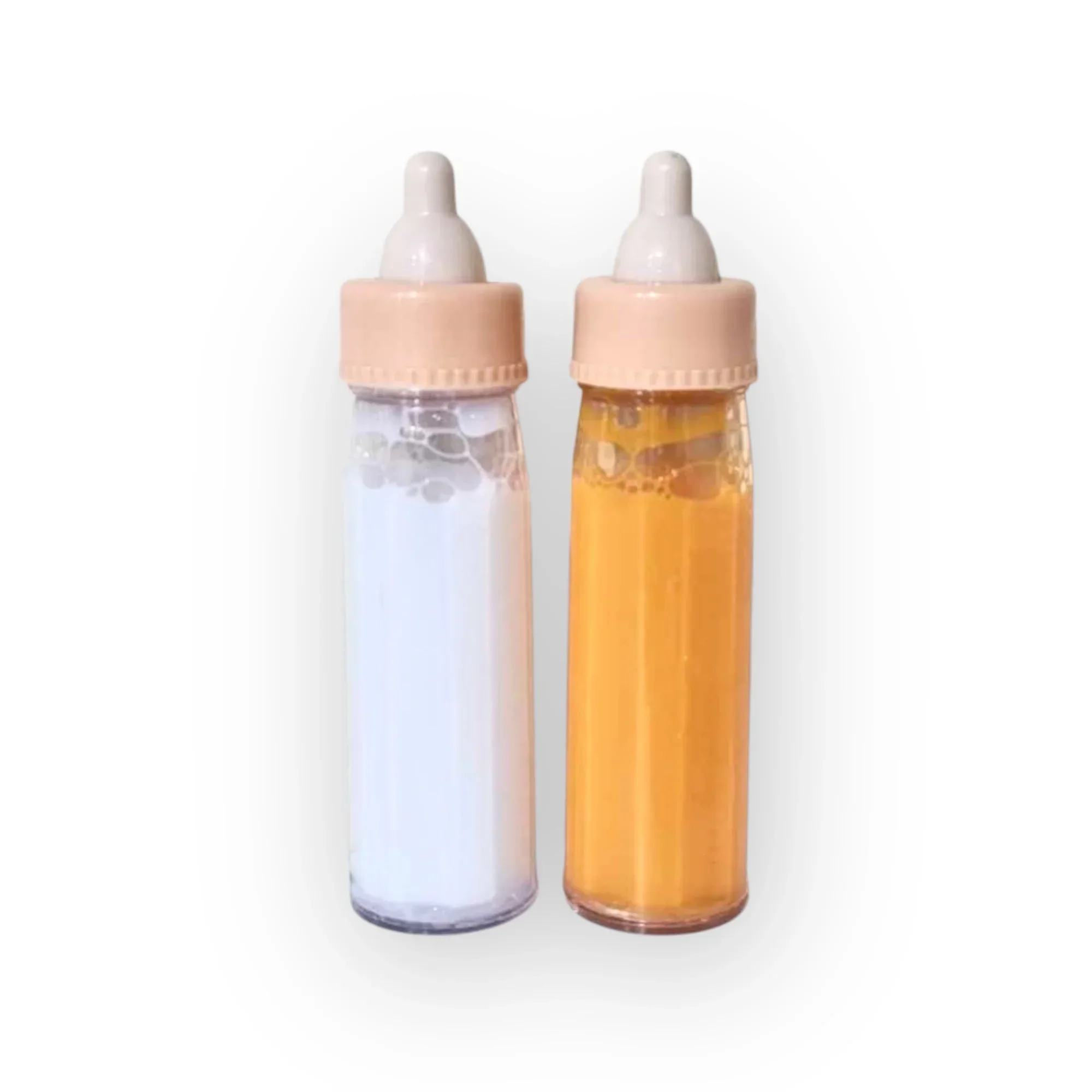 Duo de biberons magiques pour poupée : lait et jus de fruit.