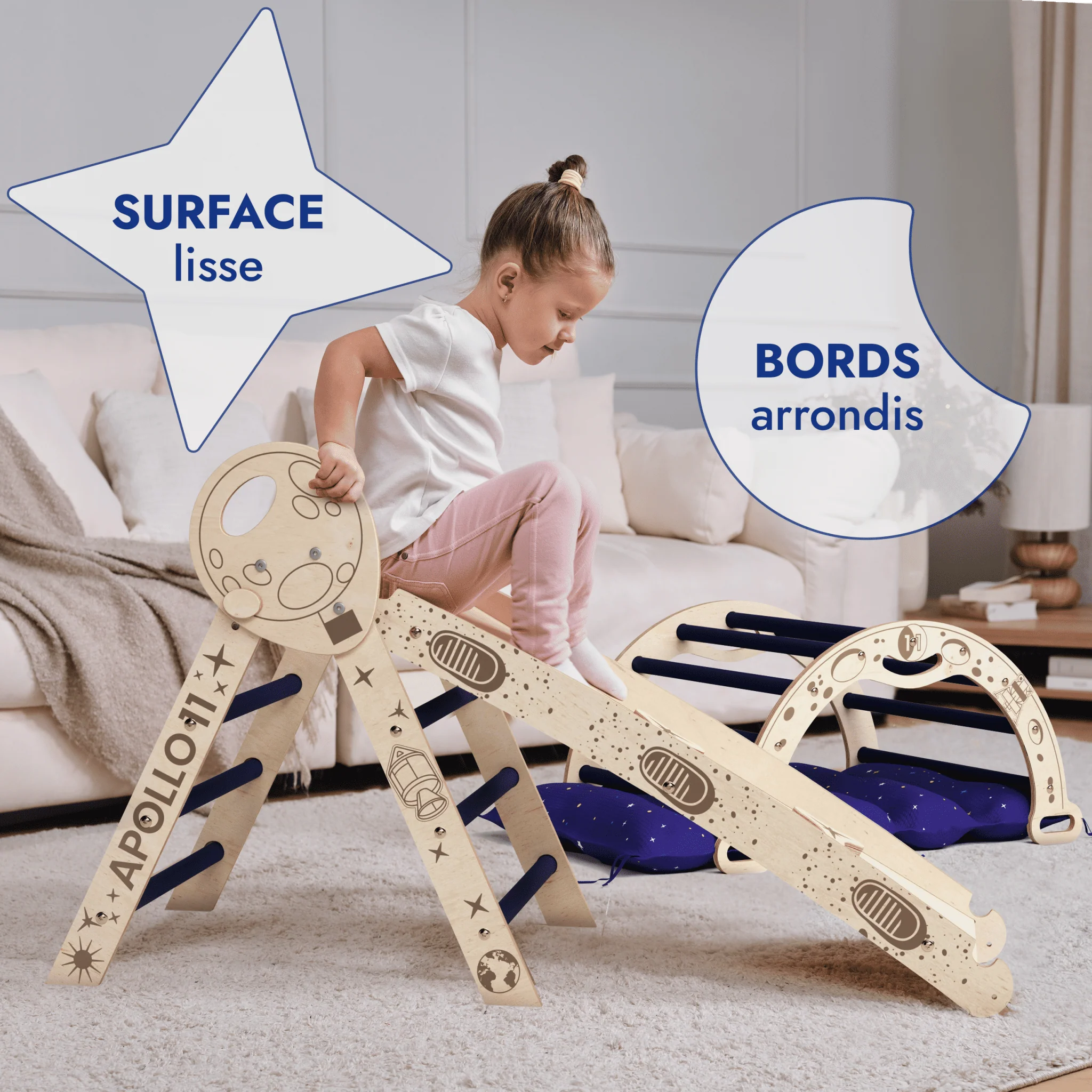 Ensemble d’Escalade Apollo 4-en-1 : Triangle Pikler, Arche, Planche de Glisse et Coussin pour Petits Astronautes en Herbe
