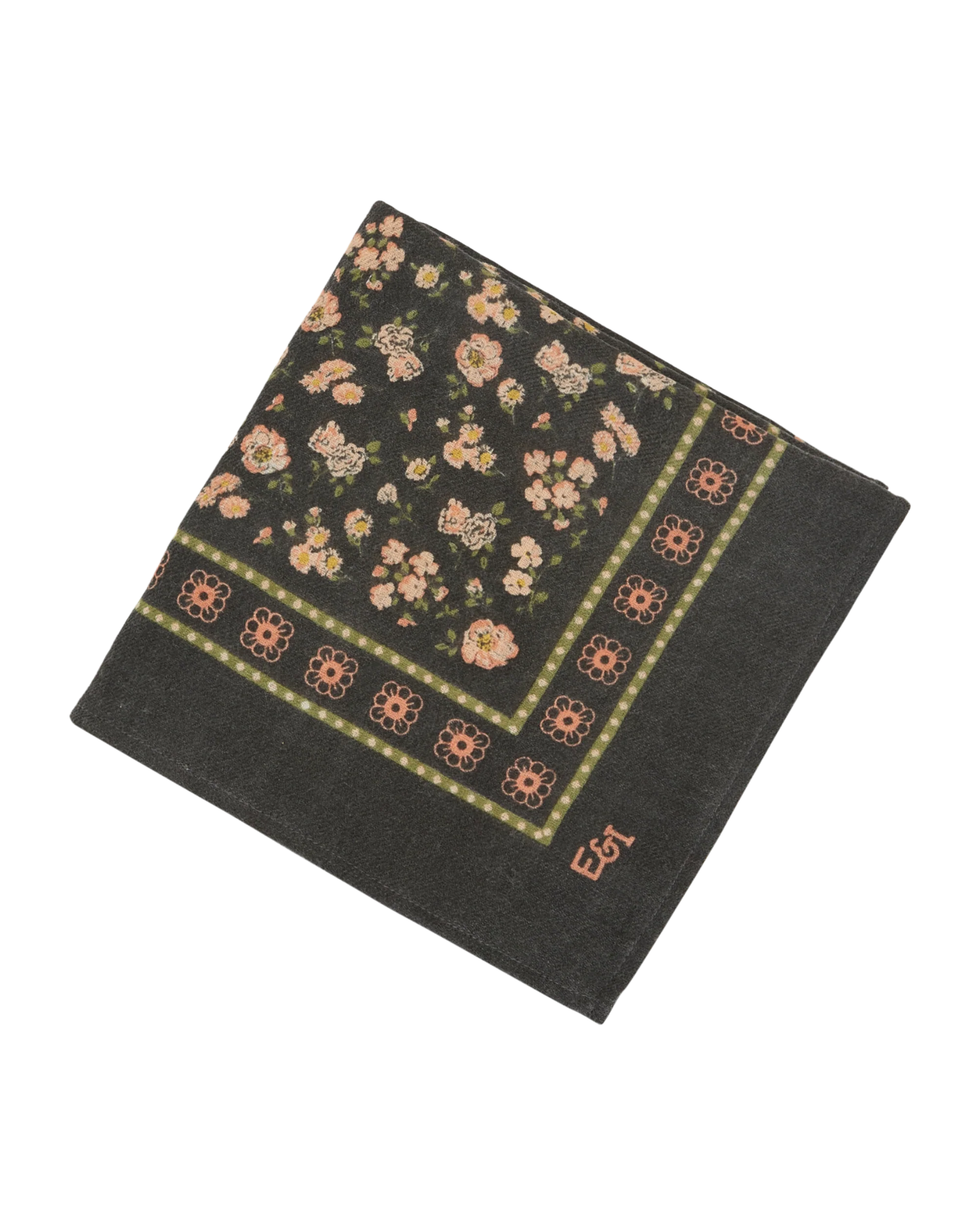 Foulard en gaze de laine aux imprimés fleuris roses et gris foncés. Des motifs clairsemés au centre, puis plus regroupés vers les bords encadrés par un alignement de fleurs stylisées. Autour du cou ou de la taille, sur la tête façon star hollywoodienne des années 50, voici un foulard qui se prête à toutes vos envies.