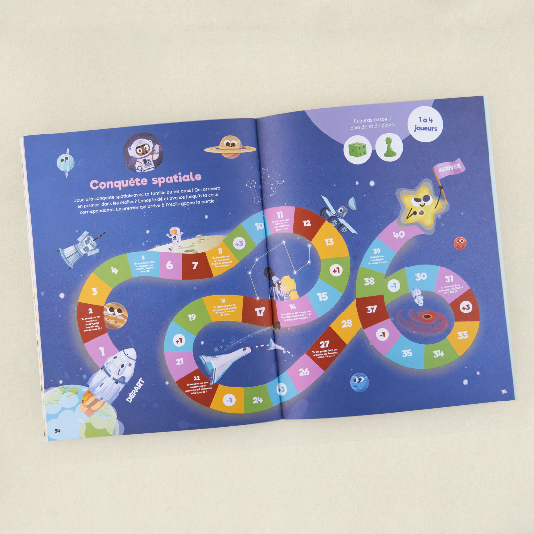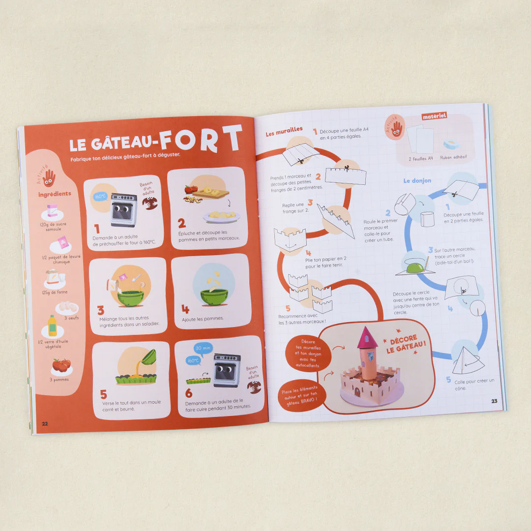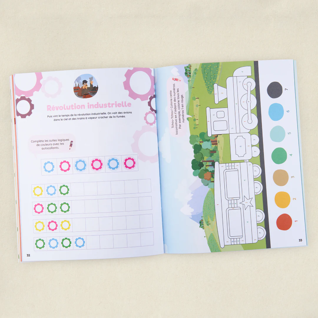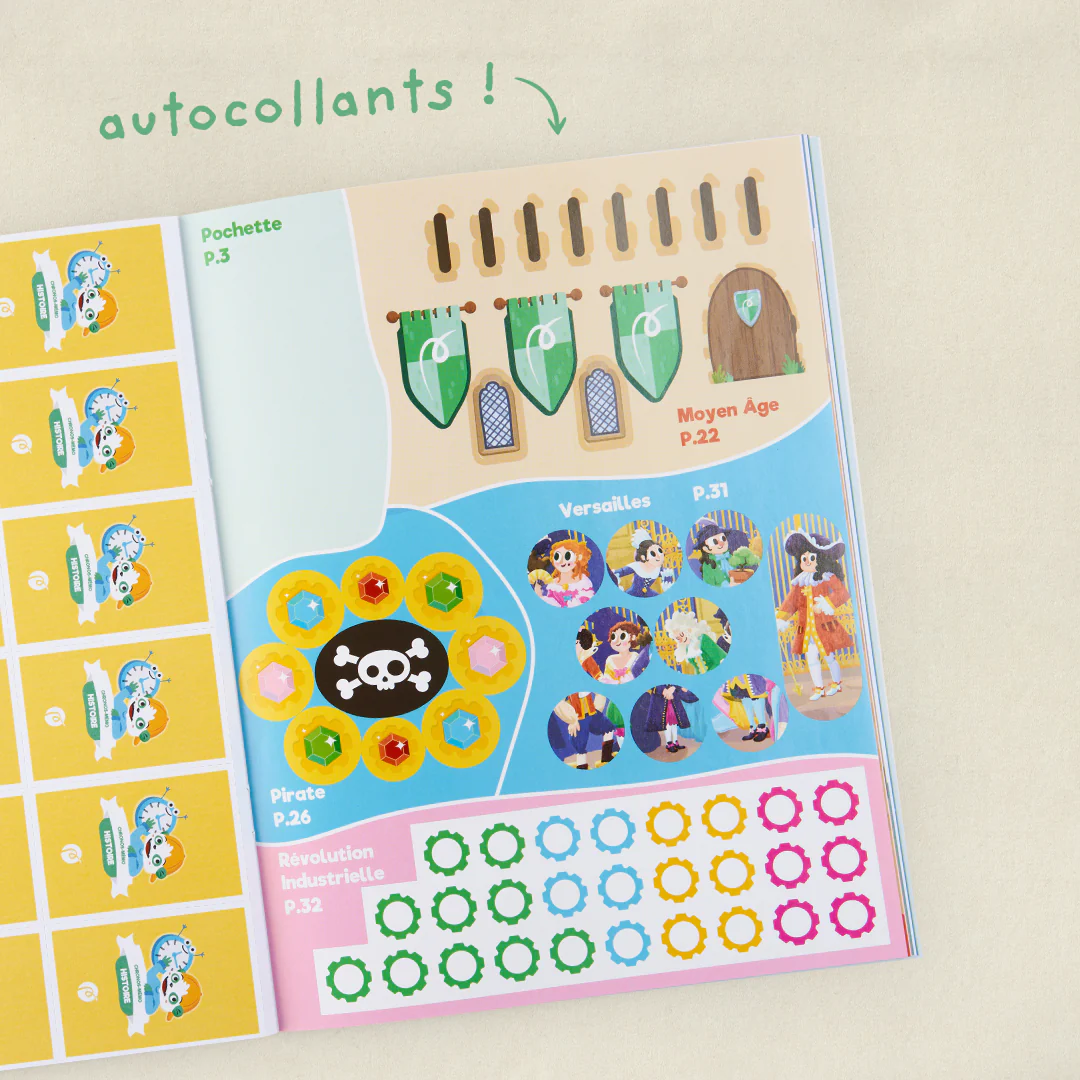 Voyage dans le temps et plonge dans 13 grandes époques qui ont fait notre Histoire ! Jeux d’observation, coloriages, recettes et DIY… des dizaines d’ activités à faire en autonomie pour t’amuser où tu veux, quand tu veux ! Inclus dans ton cahier : des stickers, un jeu de cartes et un jeu de plateau façon jeu de l’oie !