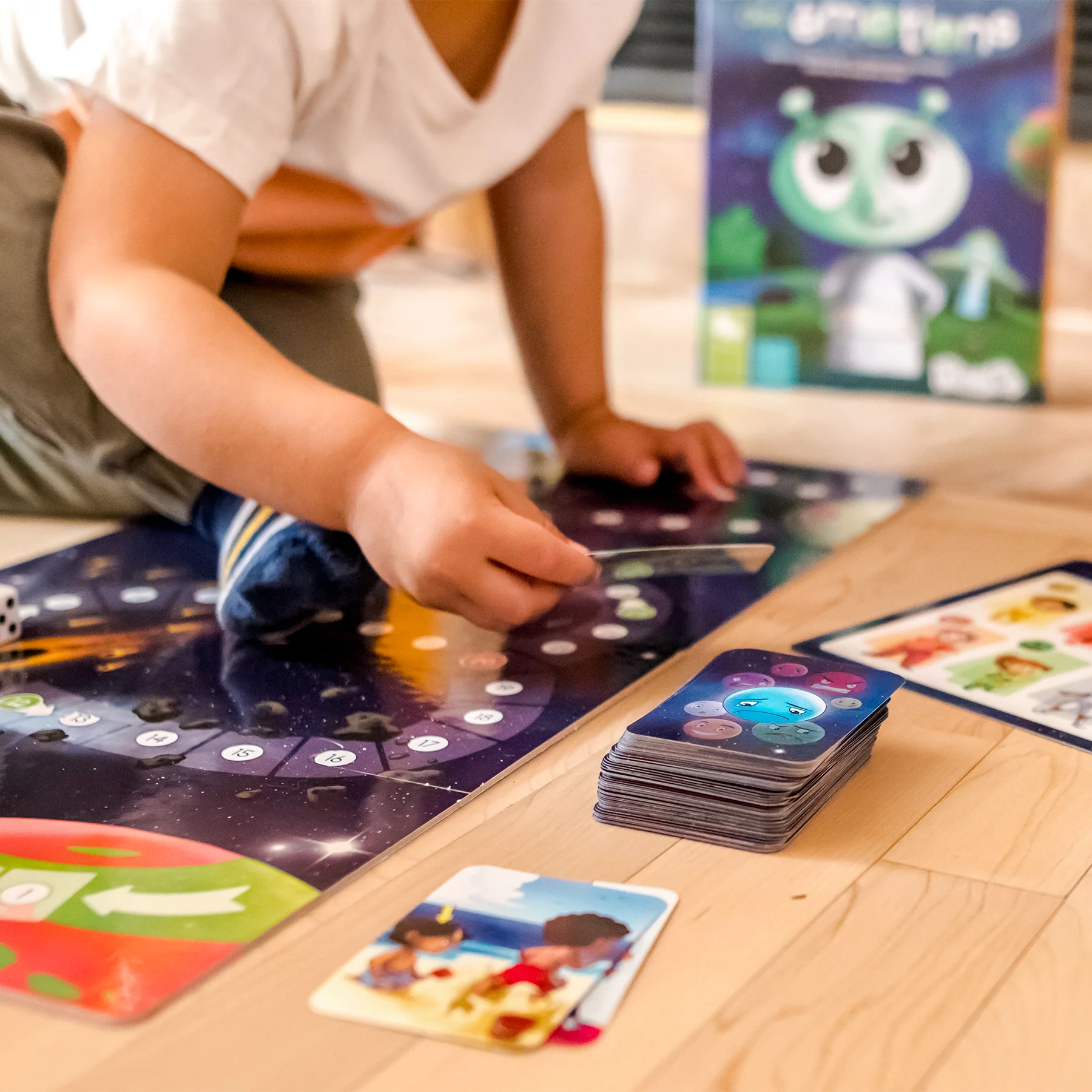 Tu dois montrer aux extraterrestres comment comprendre les émotions, car ils ne savent pas ce que c’est. Aide-les à quitter la planète Padémo pour se rendre sur la Terre et y vivre leur première émotion! Avance en lançant le dé, prends des cartes et devine les émotions ressenties par les personnages illustrés.