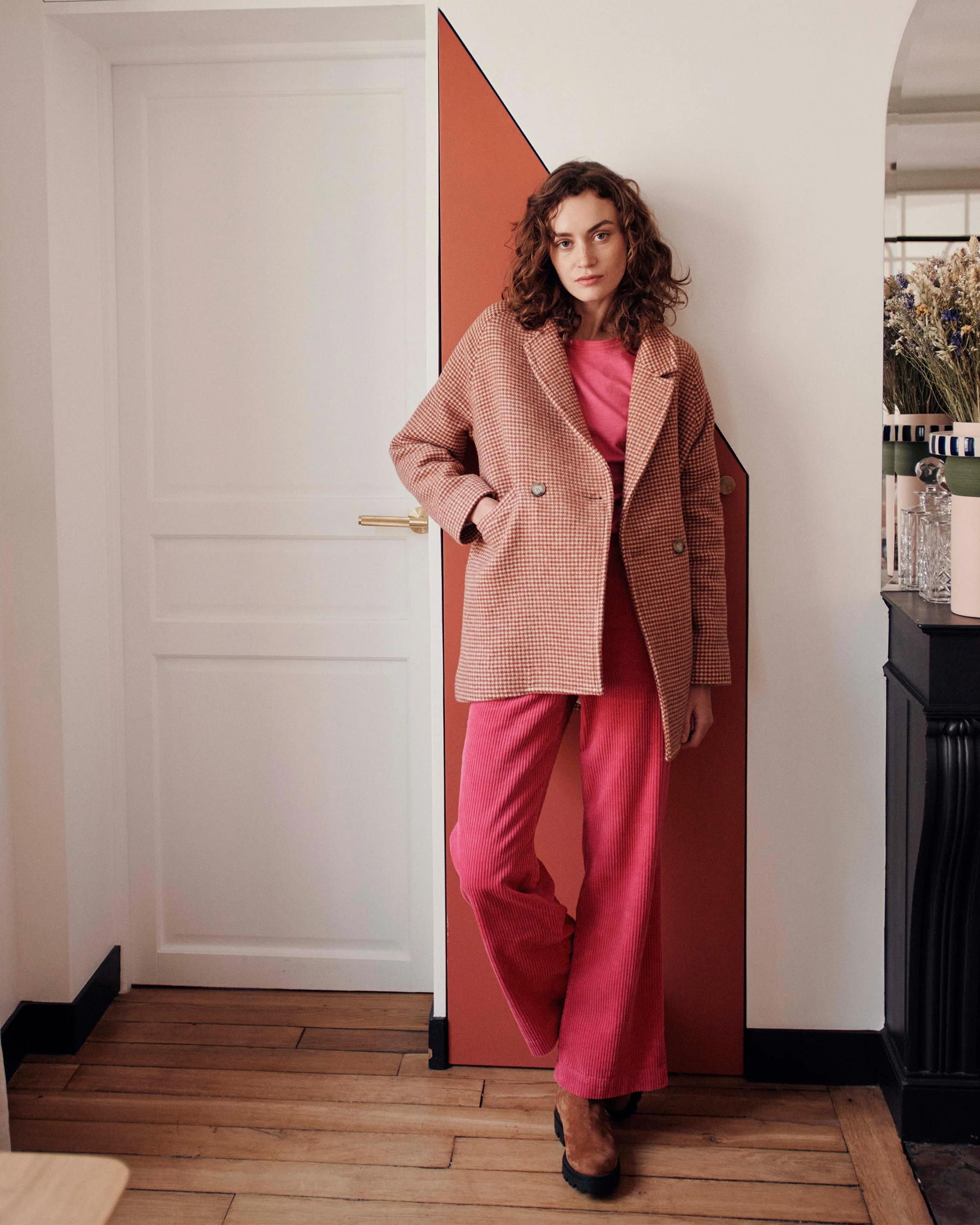 Manteau en laine au motif pied de poule rouge et rose. Coupe droite et col tailleur, emmanchures et poches raglan, double boutonnage de façade, doublure en coton et surpiqûres. On aime ce manteau pour la matière, douce et souple, qui vous gardera au chaud tout l’hiver. Rose mesure 1m75 et porte du S. Mesures pour […]