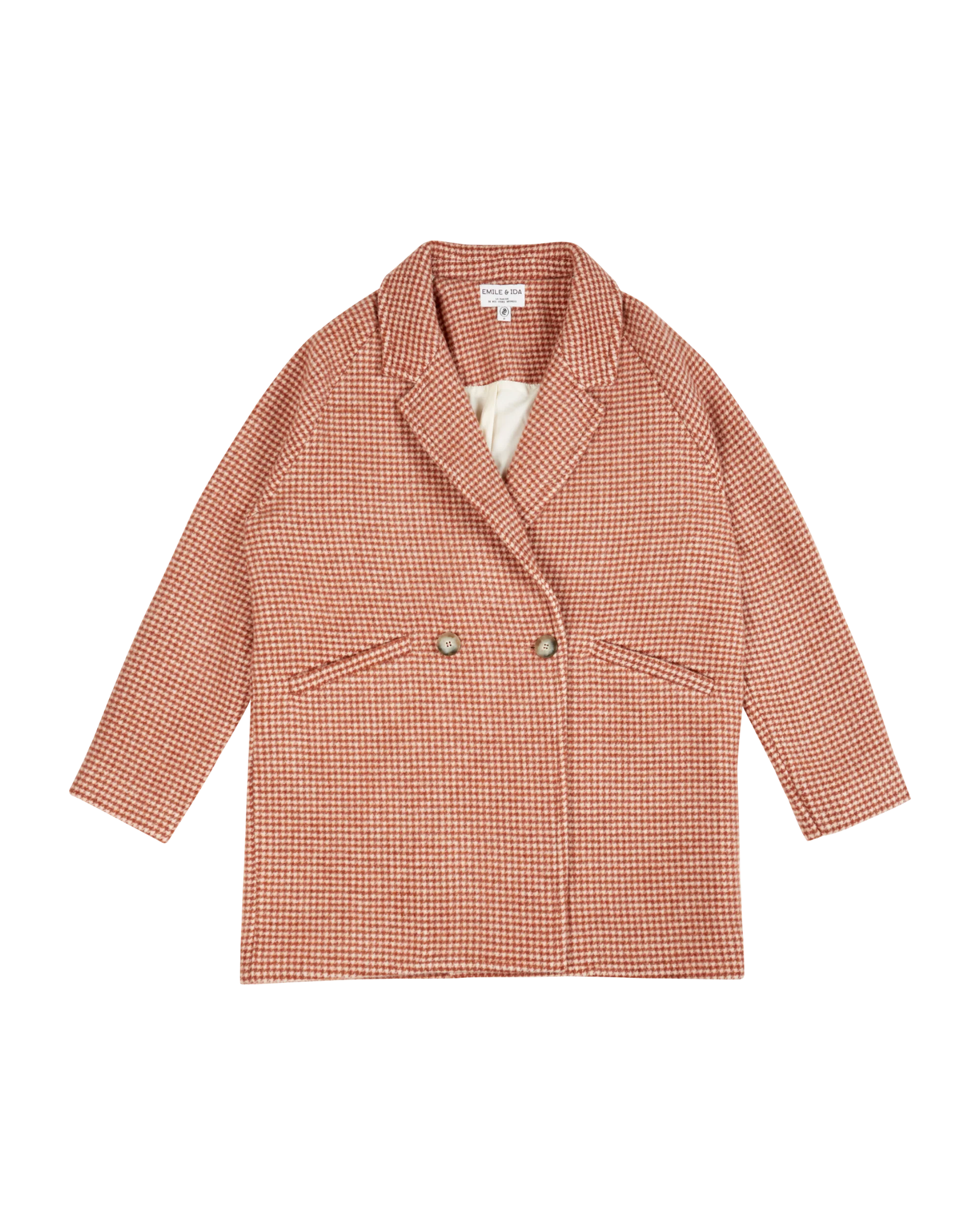 Manteau en laine au motif pied de poule rouge et rose. Coupe droite et col tailleur, emmanchures et poches raglan, double boutonnage de façade, doublure en coton et surpiqûres.