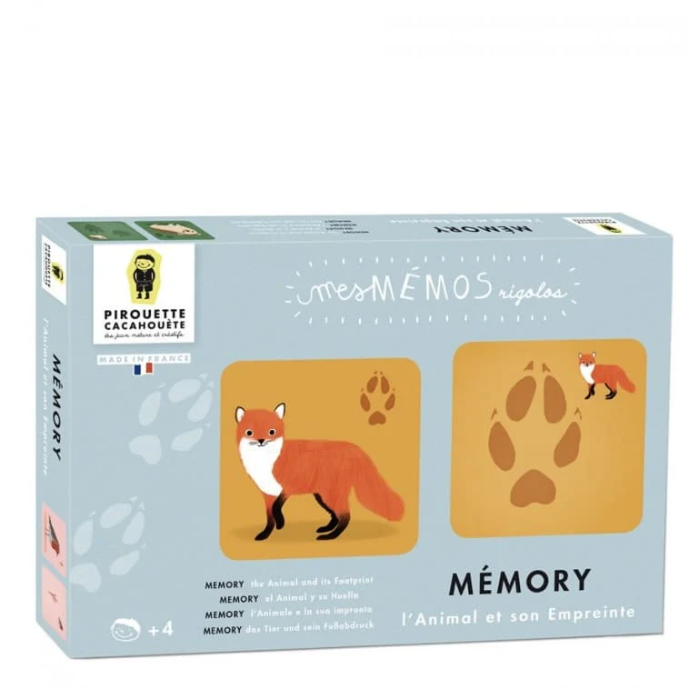 Pirouette Cacahouète présente » mes Mémos rigolos, l’Animal et son Empreinte » ! Pars sur la piste d’animaux sauvages en rassemblant les bonnes paires : l’Animal et son Empreinte !Une chasse aux images éducative qui développe la mémoire et le sens de l’observation. 40 cartes + 1 imagier