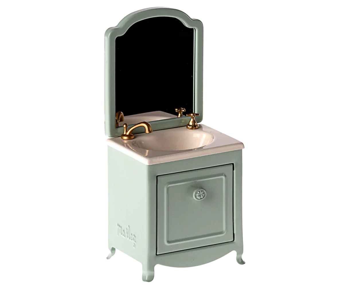 Un élément essentiel pour la salle de bains des souris. Il comporte un rangement sous l’évier et, bien sûr, un joli miroir. Ajoutez les toilettes et la baignoire Maileg pour compléter le jeu.
