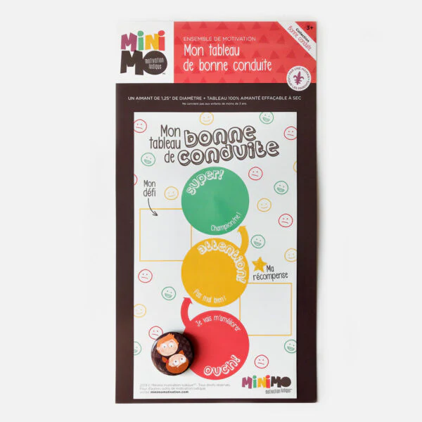 L’ensemble de motivation Mon tableau de bonne conduite est un outil pratique et ludique qui aide les enfants à réaliser rapidement les conséquences de leurs actions. Utilise-le en déplaçant l’aimant du personnage de la zone verte vers la zone jaune, et de la jaune vers la rouge, en fonction du comportement de ton mini. Félicite-le lorsqu’il arrive à rester dans la zone verte en déterminant ensemble une récompense. L’outil parfait pour motiver les enfants à adopter de bons comportements!