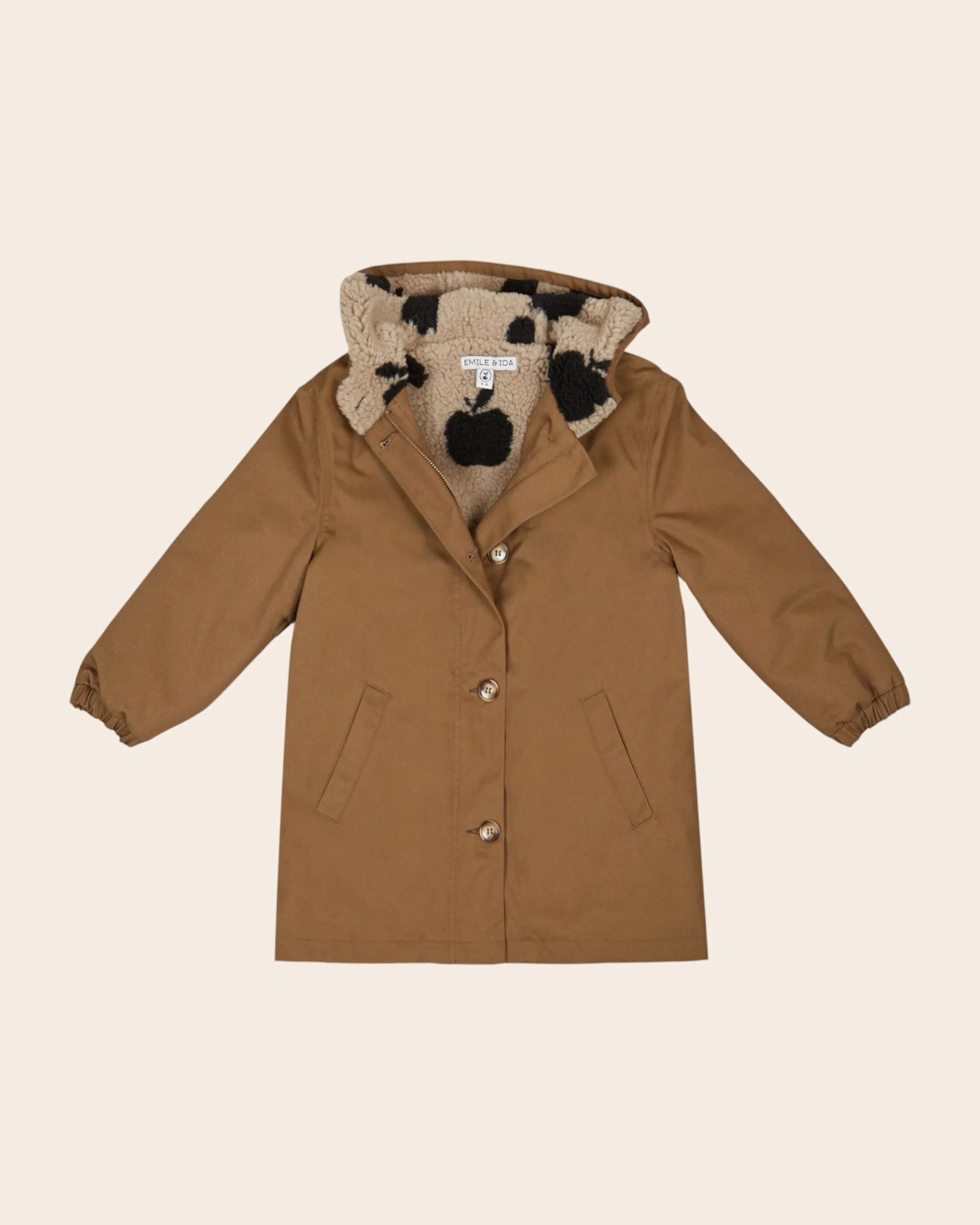 Parka à capuche en toile de coton taupe doublée de moumoute grège imprimée de grosses pommes noires. – Manches longues élastiquées aux poignets – Poches raglan – Patte de boutonnage sur la fermeture à glissière en métal – Capuche doublée de fourrure – Doublée fourrure synthétique