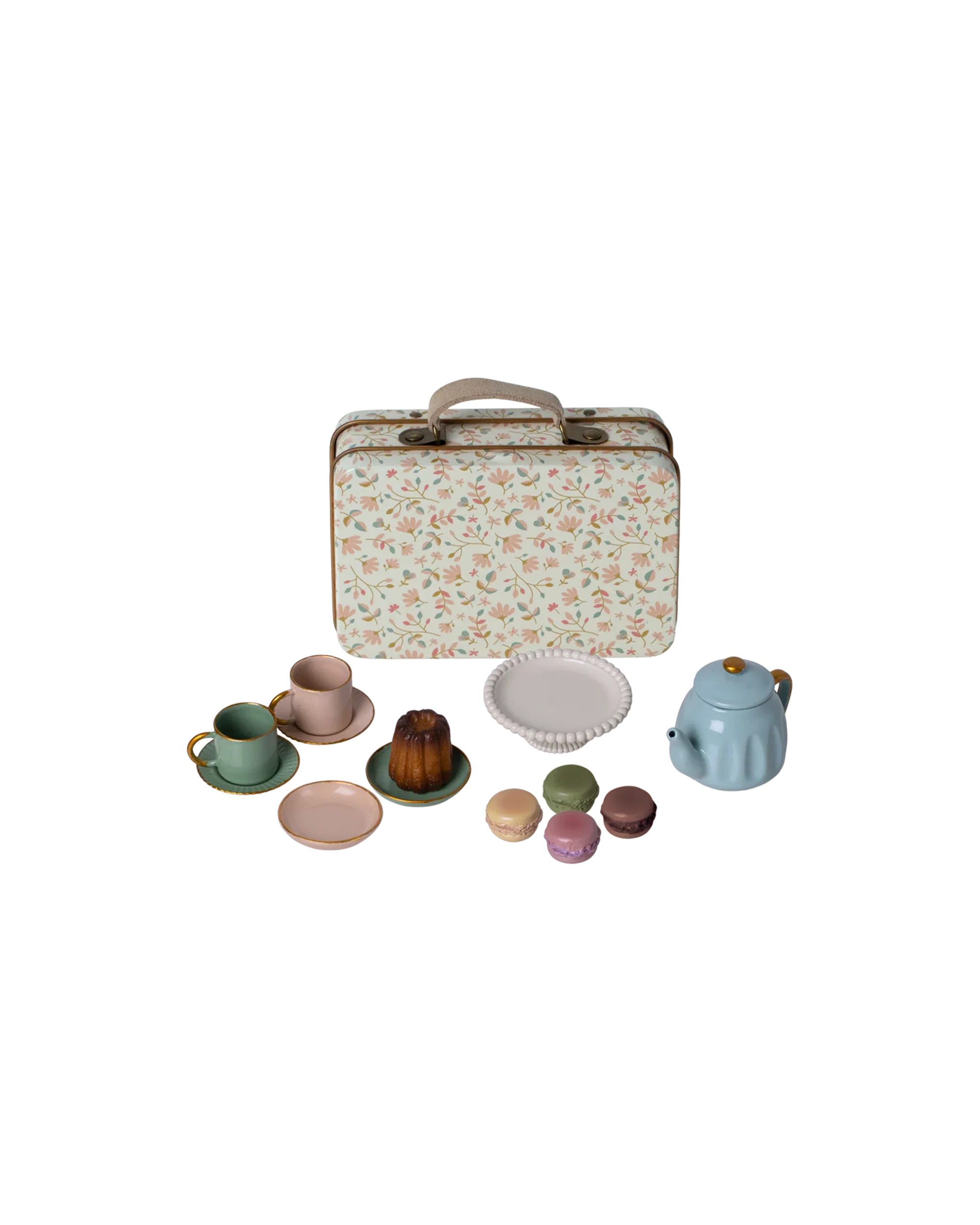 Ce service à thé est adaptée aux souris. Chaque set comprend tout ce dont vous avez besoin pour un moment cosy et un goûter gourmand. Il est présenté dans une valise en métal, joliment décorée.