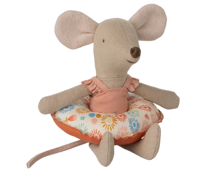 Ce jeu d’été est composé d’une petite sœur souris vêtue d’un maillot de bain bleu et de sa bouée à fleurs, portée autour de sa taille. Elle est maintenant prête pour une baignade en toute sécurité dans la mer.