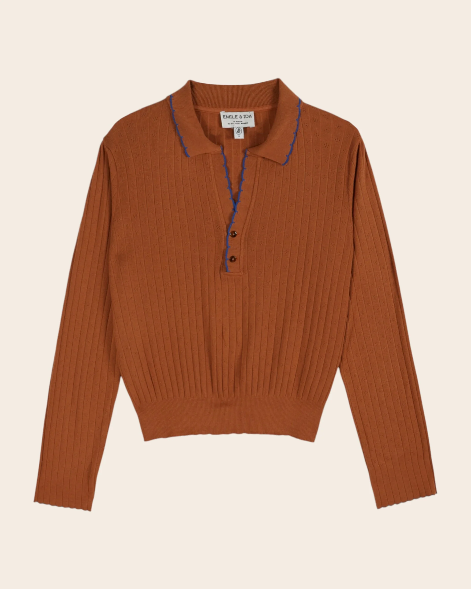Polo en modal et coton caramel – Matière d’une grande douceur – Tricoté en maille pointelle – Col polo festonné bleu – Manches longues – Poignets festonnés bleu – Patte de boutonnage festonnée bleu