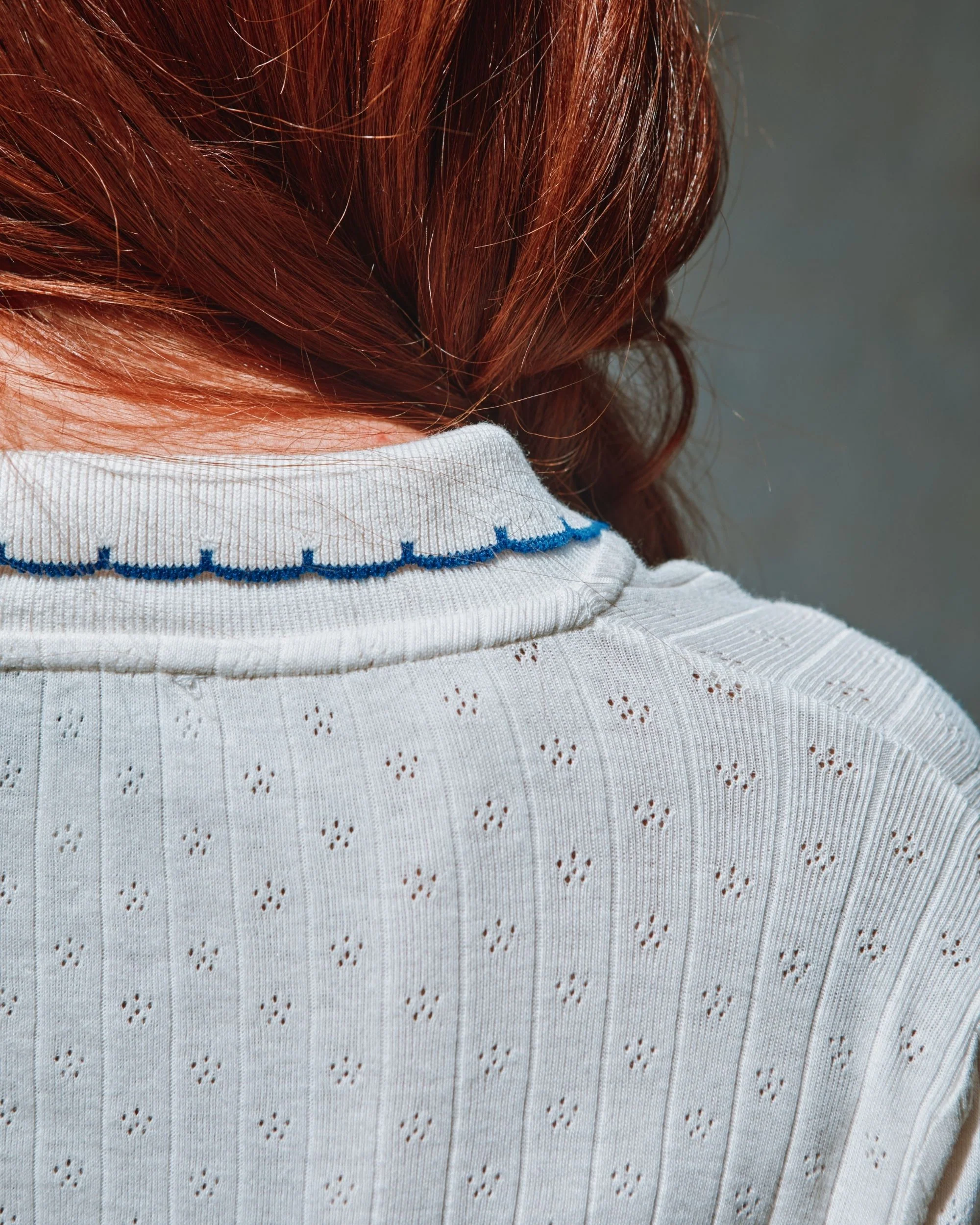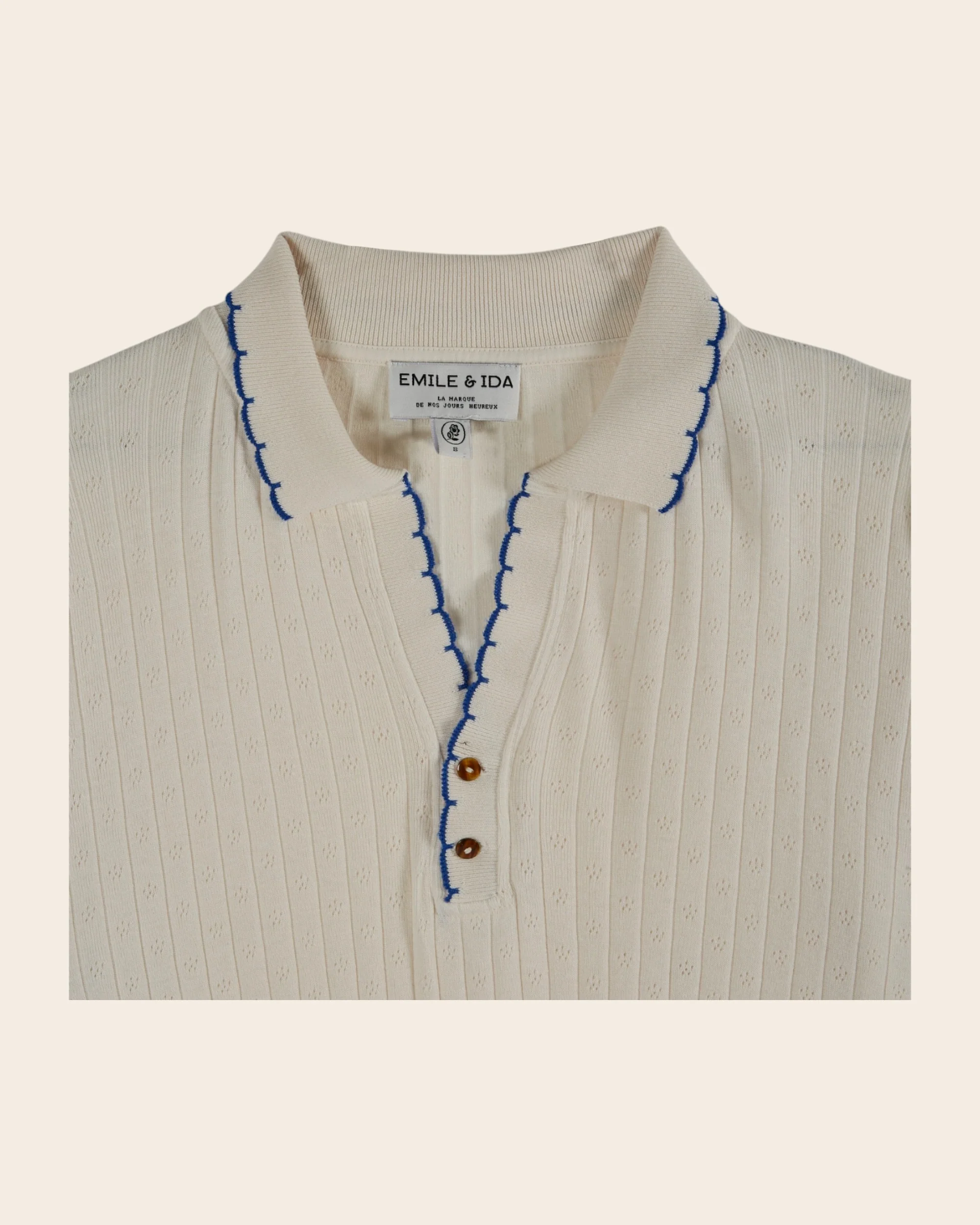 Polo en modal et coton écru au col festonné d’un liseré bleu.