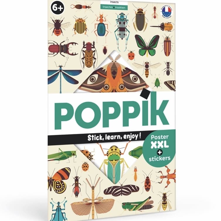 L’enfant ouvre son Poppik, déplie le grand poster et colle les vignettes sur les emplacements en suivant les numéros. Une fois l’affiche complétée, elle se transforme en jeu de “cherche et trouve”