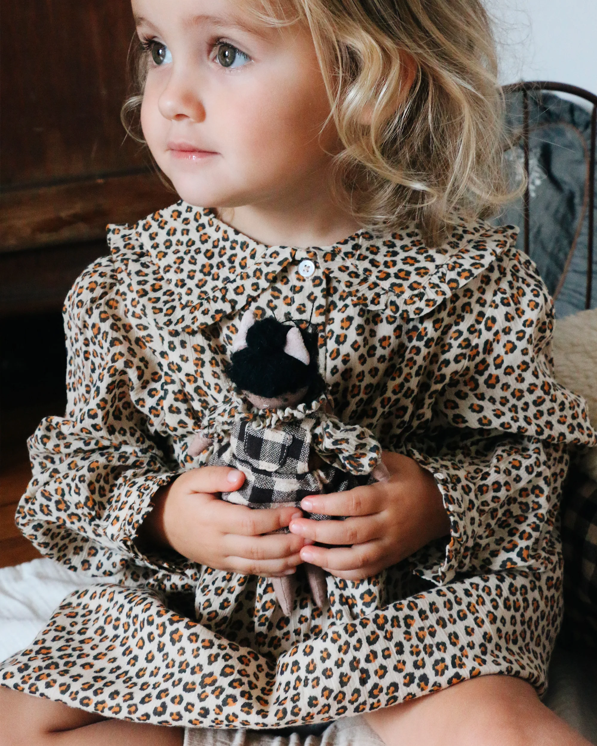 Elle est née de notre collaboration avec « Les Bons Enfants », un atelier créatif basé à Paris. Chaque poupée décorative est unique. La créatrice et ses complices apportent un soin particulier aux détails brodés à la main comme à la confection de sa blouse en voile de coton mini léopard, de son tablier vichy café et de sa jupe en velours caramel, vêtements réalisés dans les chutes de tissus issues de la collection Emile et ida de cet hiver.