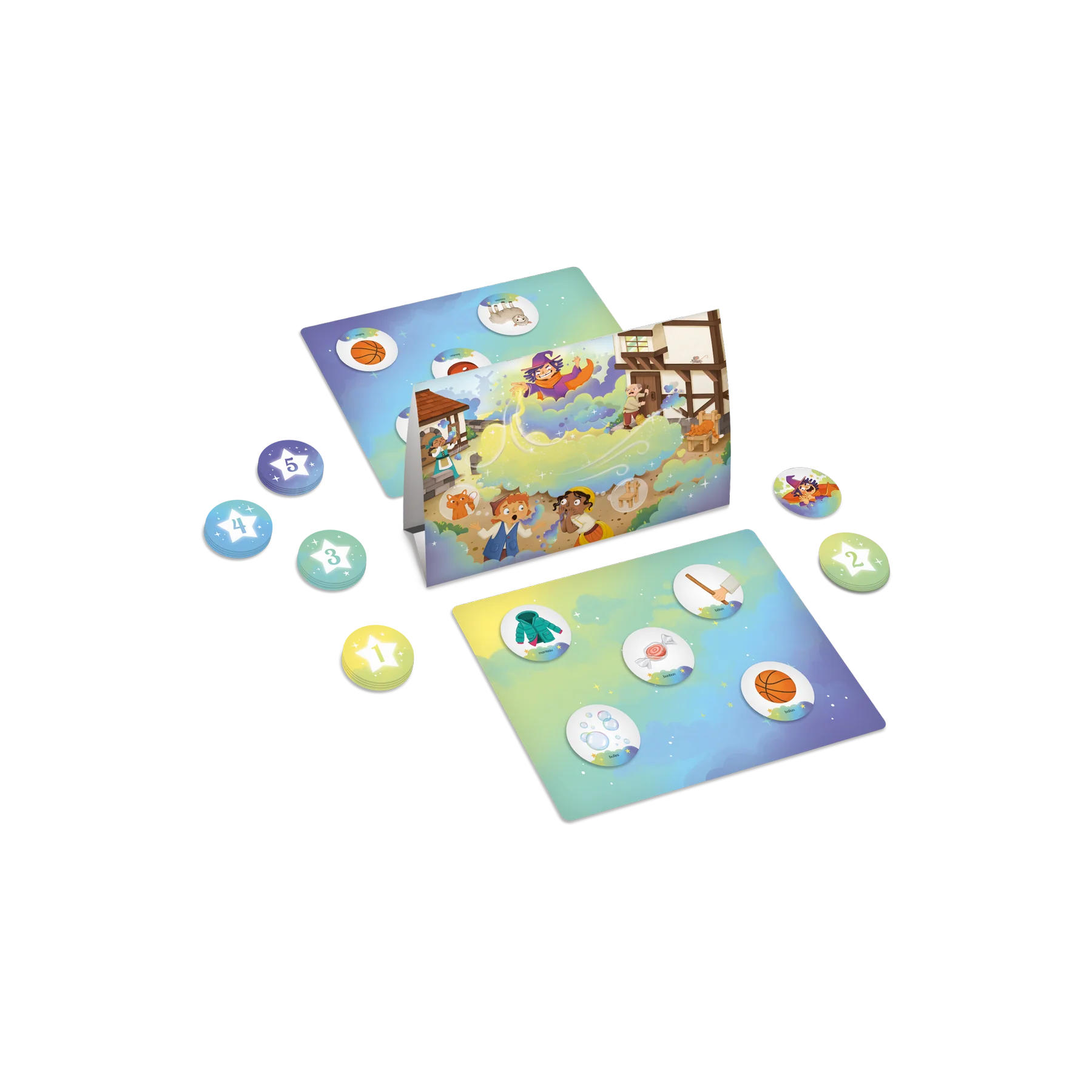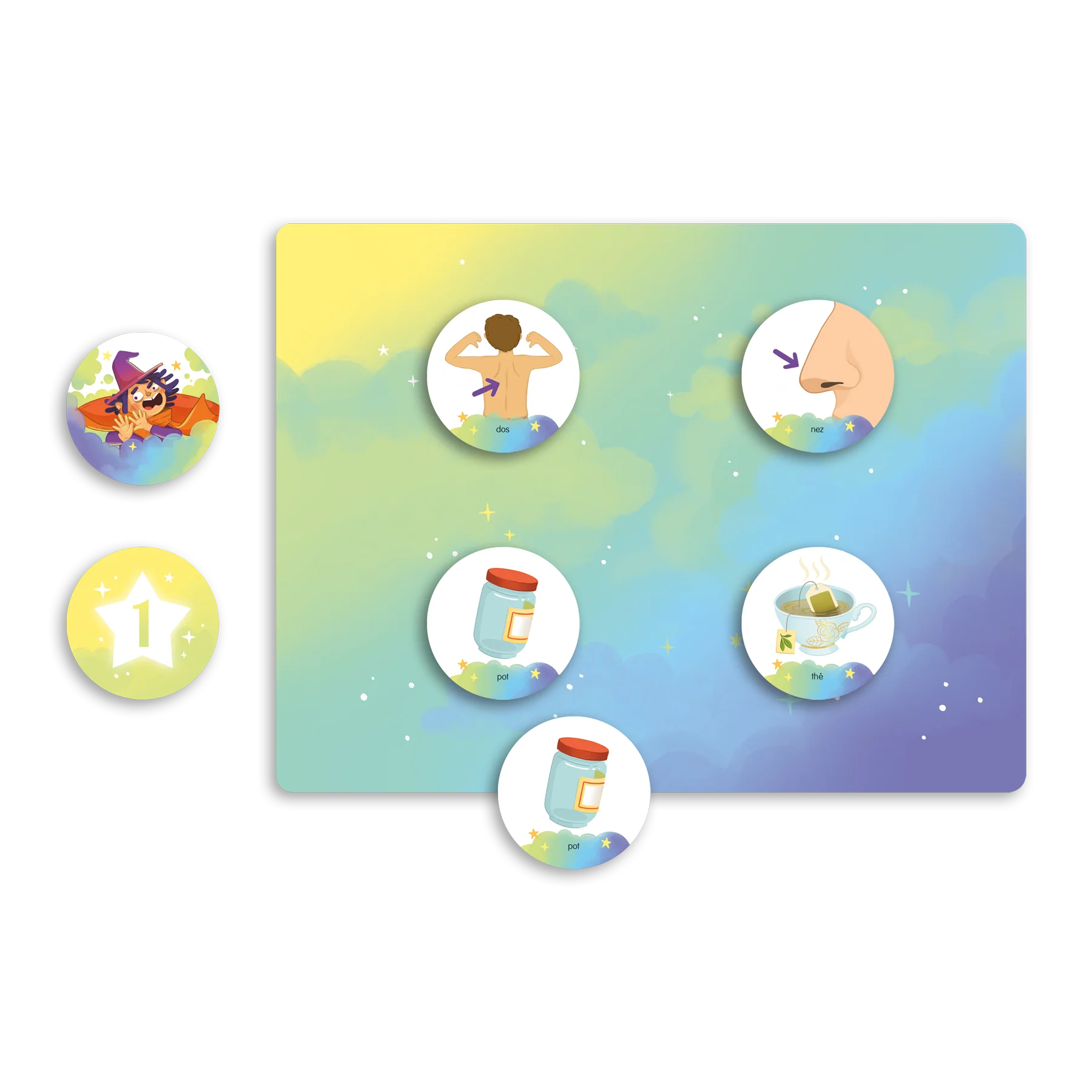 La mécanique de jeu ludique et l’accompagnement de l’adulte favorisent ainsi le développement des habiletés de prononciation de l’enfant dans le plaisir, de façon authentique et en respectant son rythme. Des variantes de jeu plus faciles sont également proposées pour permettre au jeune enfant de s’exercer à prononcer et à comprendre les mots du jeu.