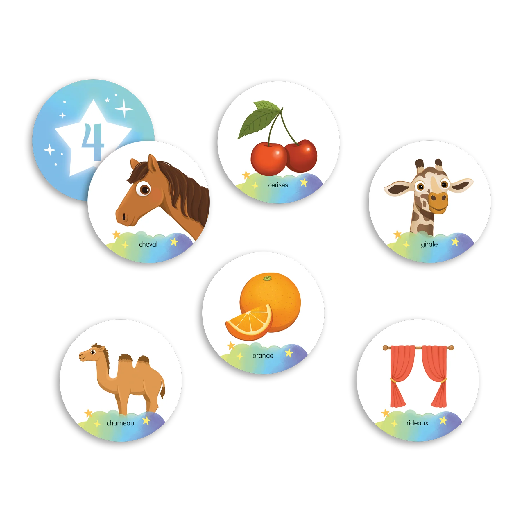• L’ensemble 4 comprend des mots composés d’une ou deux syllabes et de consonnes plus difficiles à prononcer («k», «r» et «l») comme cheval, courir, cerise, souris et girafe.