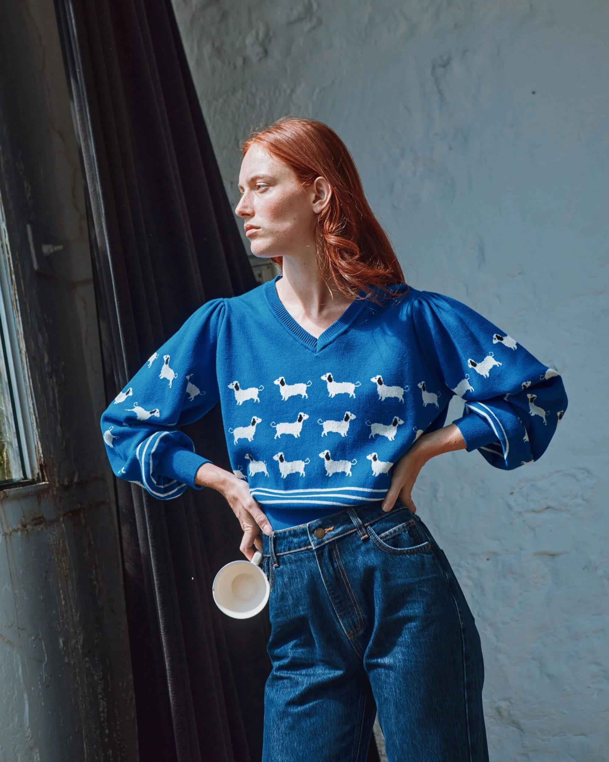 Pull-over tricoté en coton biologique bleu royal, parsemé de teckels blancs. Tricoté au point fantaisie en jacquard intarsia, ce pull vous gardera dans le moelleux et la douceur tout au long de l’hiver. – Encolure en V – Manches longues resserrées aux poignets – Finitions en côtes 1×1