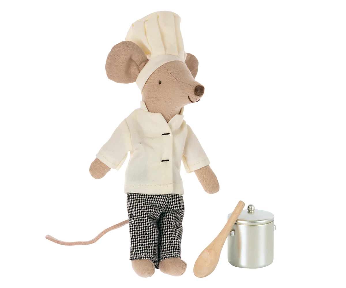 Un joli ensemble de jeu avec une souris chef, une marmite et une cuillère.