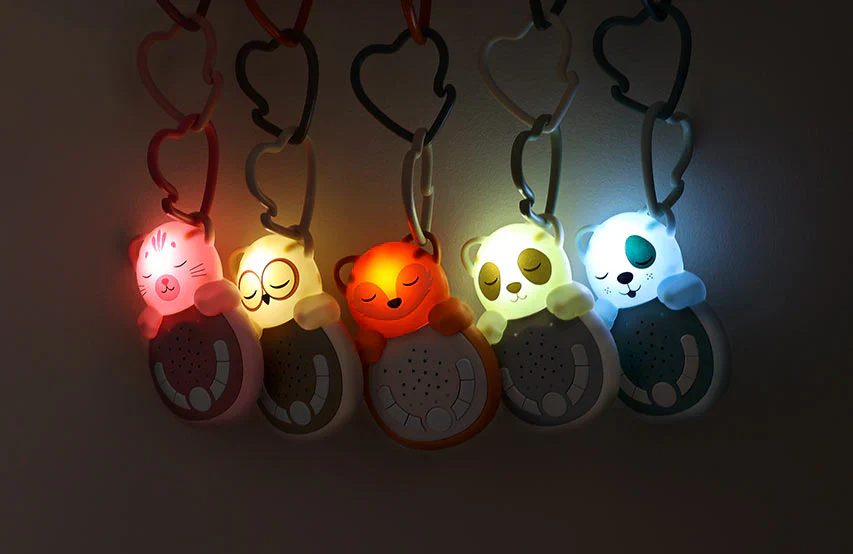 Sweet Dreamz On the Go™ – Il peut s’accrocher partout afin de suivre bébé dans ses siestes et ses nuits. Le visage s’illumine, puis diffuse 4 bruits blancs et 4 douces mélodies pour relaxer bébé. Equipé d’un smart sensor le Sweet Dreamz On the Go relancera automatiquement la dernière musique si bébé pleure pour l’apaiser. Il est équipé d’une minuterie automatique, 15 min pour la lumière et 45 min pour les sons.